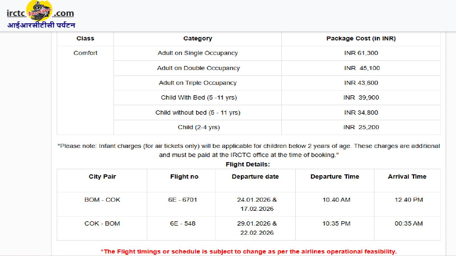 यह पैकेज मुंबई के लोगों के लिए है। इस पैकेज में फ्लाइट टिकट भी शामिल हैं। इसका मतलब है कि आपको मुंबई से केरल के लिए राउंड-ट्रिप फ्लाइट मिलेगी। 24 जनवरी को, आपको मुंबई एयरपोर्ट से सुबह 10:40 बजे फ्लाइट मिलेगी, जो दोपहर 12:40 बजे केरल पहुंचेगी। इसके अलावा, इसमें होटल में रहने, कैब और सभी खाने का खर्च शामिल है।