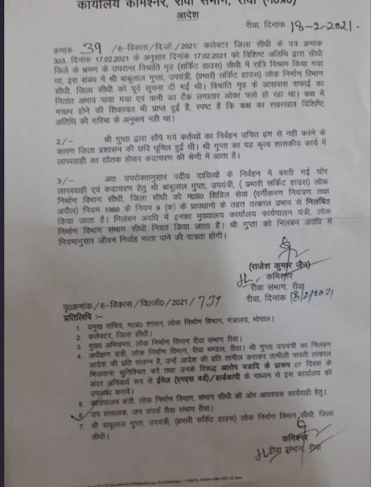 मुख्यमंत्री को हुई इस परेशानी की जानकारी गुरुवार को मंत्रालय पहुंची। सर्किट हाउस के प्रभारी इंजीनियर बाबूलाल गुप्ता को निलंबित कर दिया गया। बता दें कि सीएम शिवराज सिंह चौहान 16 फरवरी को सीधी में हुए बस हादसे के बाद पीड़ितों का हाल जानने के लिए पहुंचे थे।
