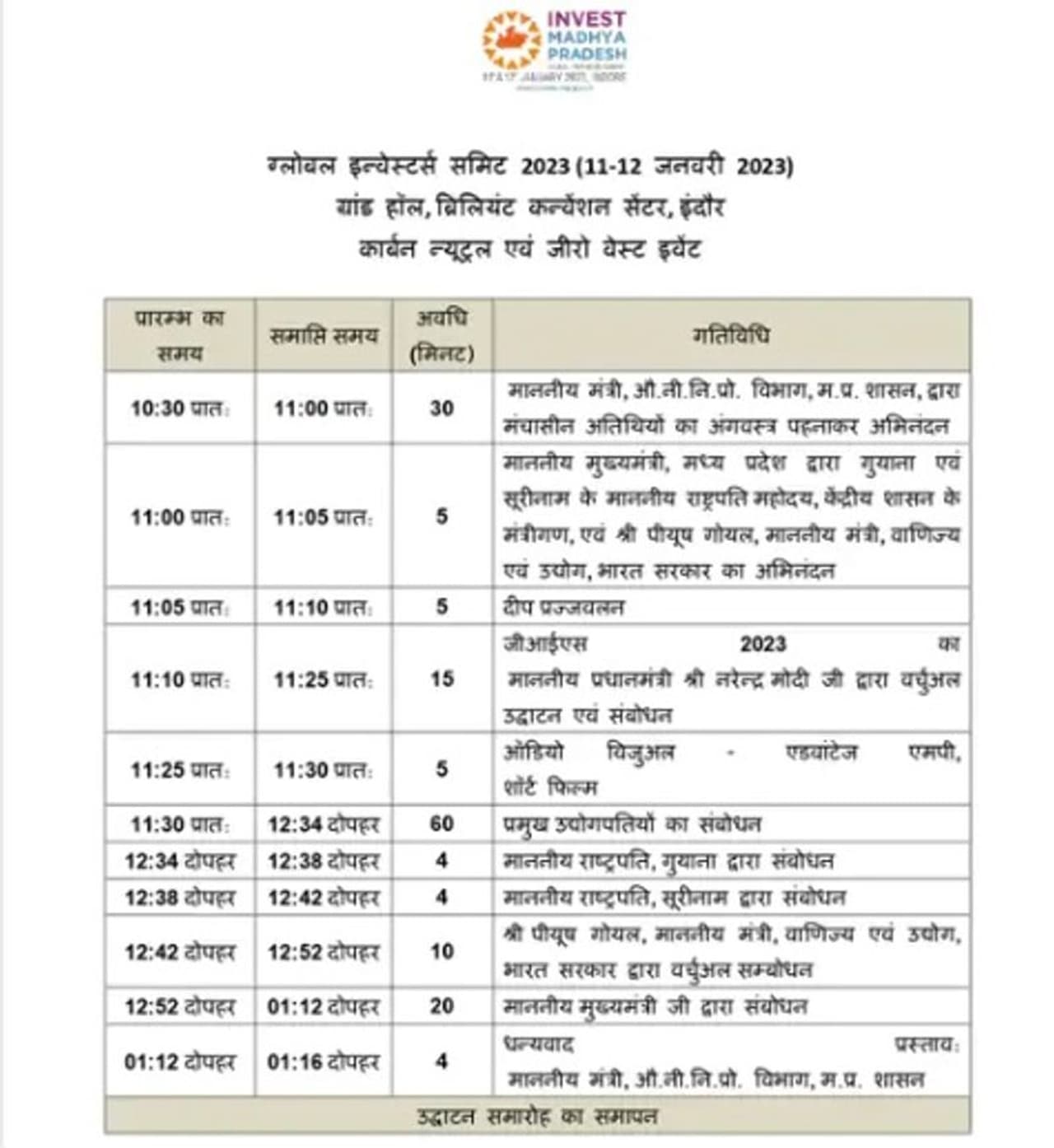 इंदौर(Madhya Pradesh). इंदौर में 11 और 12 जनवरी को छटवें ग्लोबल इन्वेस्टर्स समिट का आयोजन किया जा रहा है। ग्लोबल इन्वेस्टर्स समिट में कई विषयों पर 19 समानांतर सत्र होंगे। इंदौर के ब्रिलिएंट कन्वेंशन सेंटर में इन सत्रों में देश-विदेश के निवेशक शामिल हो रहे हैं। प्रधानमंत्री नरेंद्र मोदी समिट का वर्चुअली शुभारंभ कर संबोधित कर रहे हैं । शुभारंभ सत्र में सूरीनाम के राष्ट्रपति चंद्रिका प्रसाद संतोखी एवं गुयाना के राष्ट्रपति डा. मोहम्मद इरफान अली का संबोधन भी होगा। इस सत्र में विदेश मंत्री एस जयशंकर और उद्योग मंत्री पीयूष गोयल का वर्चुअल संबोधन होगा। समिट को मुख्यमंत्री शिवराज सिंह चौहान भी संबोधित करेंगे। समिट की शुरुआत सुबह 10:30 बजे ब्रिलिएंट कन्वेंशन सेंटर में कर दी गई है।