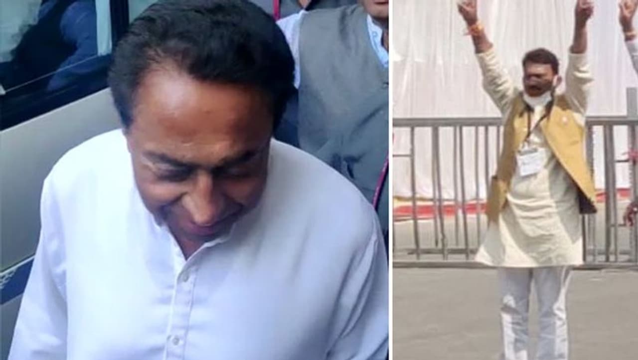 (तस्वीर में पूर्व मुख्यमंत्री कमलनाथ हार के बाद प्रदेश कांग्रेस कार्यालय से निकलते हुए..दूसरे चित्र में तुलसी सिलावट जीत का इशारा करते हुए)