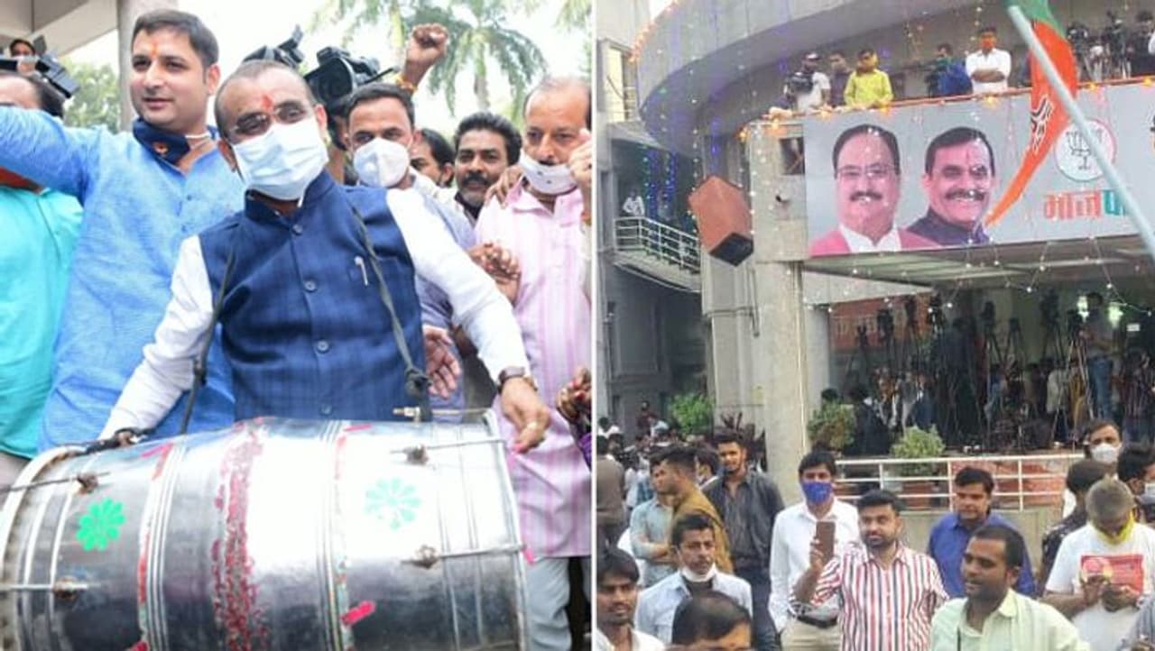 एमपी उपचुनाव: रुझान में जीत देख भोपाल में जश्न शुरु, CM Shivraj ने कार्यकर्ताओं को खिलाई जलेबी