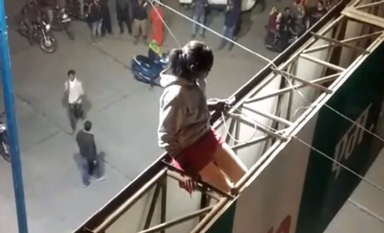 होर्डिंग पर चढ़ करती रही हंगामा..देखने लगी भीड़