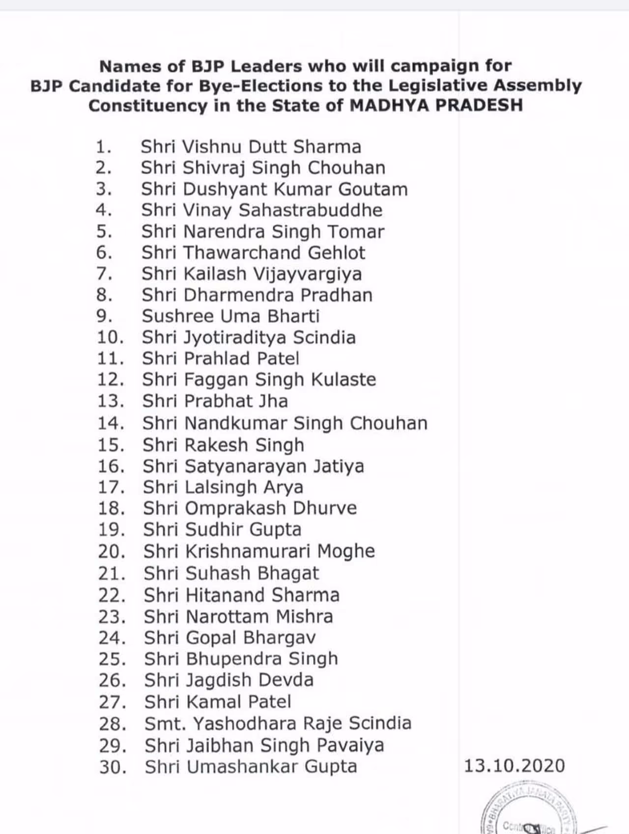 मध्य प्रदेश के इन उपचुनावों में स्टार प्रचारकों की सूची में कुल 30 लोगों के नाम शामिल हैं। जिसमें पहले स्थान पर पार्टी प्रदेश अध्यक्ष विष्णु दत्त शर्मा का नाम है, जबकि दूसरे नंबर पर मुख्यमंत्री शिवराज सिंह चौहान, तीसरे स्थान पर दुष्यंत कुमार गौतम, चौथा नाम विनय सहस्त्रबुद्धे और वहीं पांचवा नाम मोदी सरकार में केंद्रीय कृषि मंत्री नरेंद्र सिंह तोमर है। जबकि ज्योतिरादित्य सिंधिया का नाम इस लिस्ट में 10वें नंबर पर रखा गया है। वहीं टॉप-10 में केन्द्रीय मंत्री धमेंद्र प्रधान, पार्टी महासचिव कैलाश विजयवर्गीय, वरिष्ठ नेता उमा भारती, , केन्द्रीय मंत्री प्रहलाद पटेल, फग्गन सिंह कुलस्ते के नाम भी शामिल हैं।