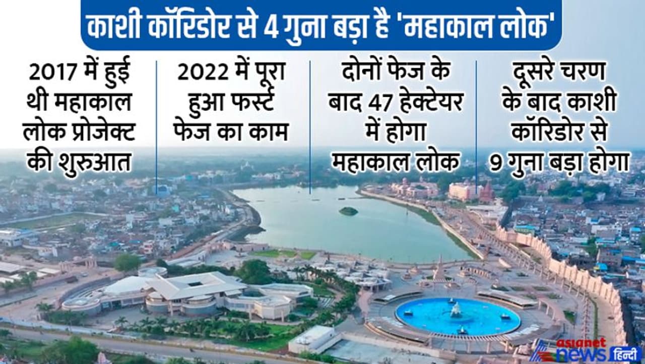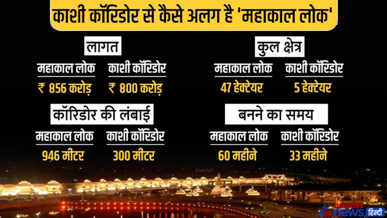 Mahakal Lok Ujjain: काशी के विश्वनाथ कॉरिडोर की तर्ज पर 12 ज्योतिर्लिंगों में से एक यानी उज्जैन के महाकालेश्वर में 'महाकाल लोक' (Mahakal Lok) का पहला फेज पूरा हो चुका है। प्रधानमंत्री नरेंद्र मोदी 11 अक्टूबर, मंगलवार को इसका लोकार्पण कर देश को समर्पित करेंगे। महाकाल लोक को भले ही काशी कॉरिडोर की तर्ज पर बनाया गया है, लेकिन यह आकार में उससे 4 गुना बड़ा है। दूसरे फेज का काम पूरा होने के बाद यह काशी कॉरिडोर से 9 गुना ज्यादा बड़ा होगा। महाकाल लोक में भक्त 946 मीटर (करीब 1 किलोमीटर) लंबे गलियारे में चलते हुए महाकाल मंदिर के गर्भगृह तक पहुंचेंगे।