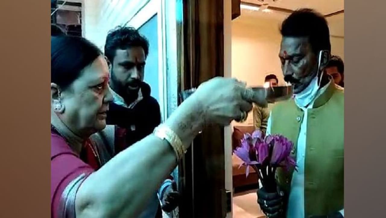 यह तस्वीर सांवेर से भाजपा के टिकट पर चुनाव लड़े तुलसी सिलावट की है। जब वे घर से निकलने लगे, तो पत्नी ने उनकी आरती उतारी।