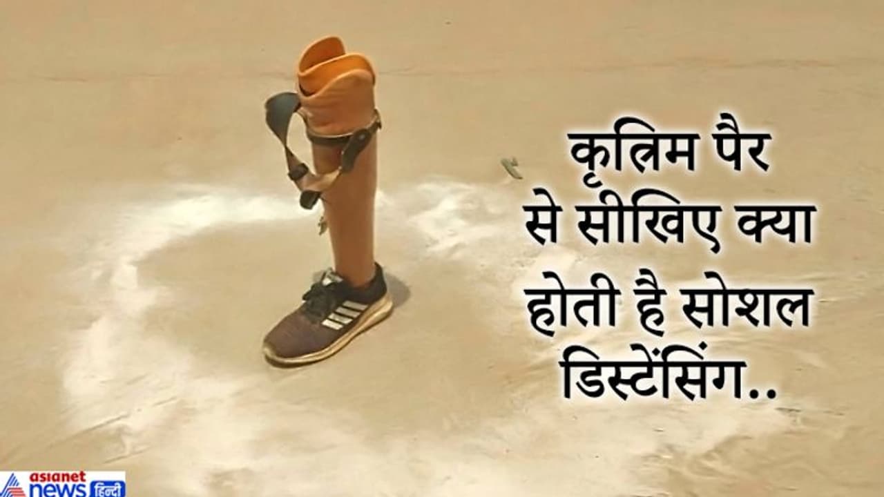 अशोकनगर (मध्य प्रदेश). देश में हर दिन अलग-अलग इलाकों से सोशल डिस्टेंसिंग की धज्जियां उड़ाने वाली खबरें आती रहती हैं। लेकिन, मध्य प्रदेश से एक ऐसी तस्वीर देखने को मिली, जहां एक दिव्यांग ने लोगों का दिल जीतने वाले काम से सोशल डिस्टेंसिंग का पालन किया। उसने नियम को बनाये रखने के लिए अपना कृत्रिम पैर खोलकर गोल घेरे में रख दिया।