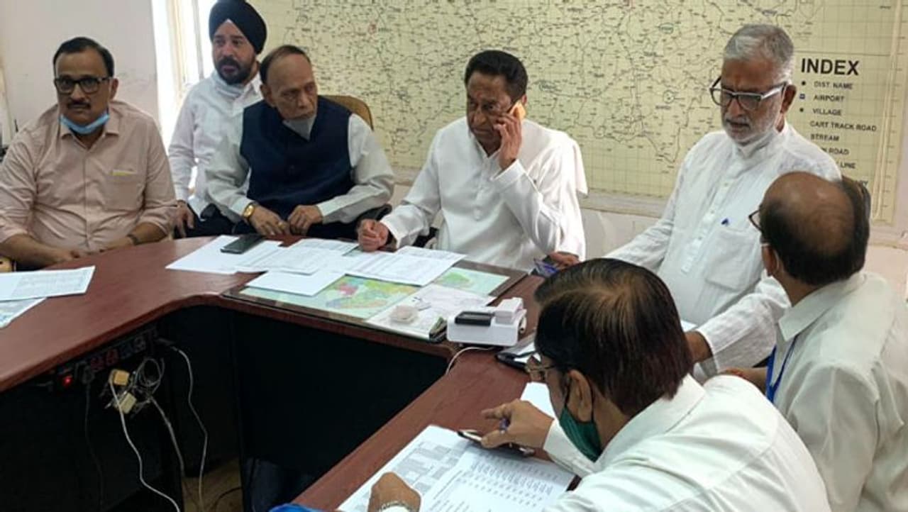 (पीसीसी दफ्तर में नेताओं ने चुनावी समीक्षा करते पूर्व मुख्यमंत्री कमलनाथ)