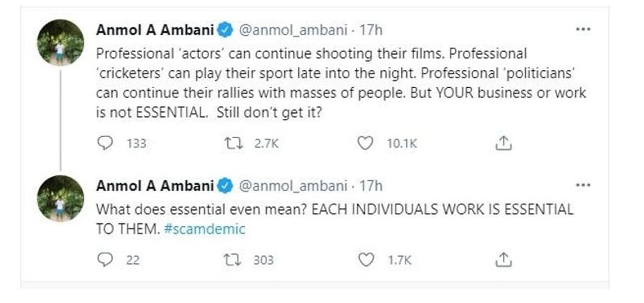 अनिल अंबानी के बड़े बेटे अनमोल ने ट्वीट कर कहा है कि 'एक्टर्स, क्रिकेटर्स,राजनीतिज्ञों को अपना काम बिना किसी रोक-टोक के करने दिया जा रहा है, लेकिन कारोबार पर प्रतिबंध लगाया जा रहा है।