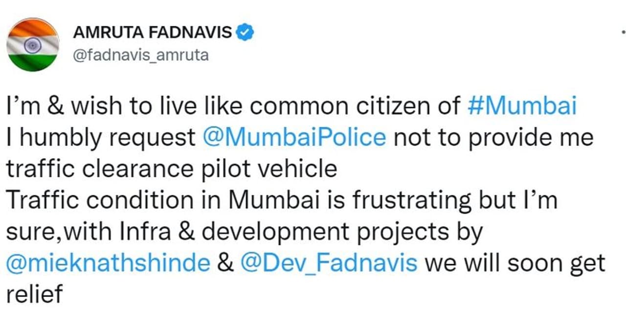 अमृता ने ट्वीट किया कि मैं मुंबई की एक आम नागरिक हूं और आम नागरिक के रूप में ही जाना चाहती हूं। मेरी विनम्रतापूर्वक मुंबई पुलिस से निवेदन है कि मुझे ट्रैफिक क्लीयरेंस के लिए पायलट गाड़ी नहीं दी जाए। मुंबई में यातायात की स्थिति निराशाजनक है। मैं निश्चिंत हूं कि मुख्यमंत्री एकनाथ शिंदे और उपमुख्यमंत्री देवेंद्र फडणवीस द्वारा किए जा रहे इंफ्रास्ट्रक्चर डेवलपमेंट प्रोजेक्ट के काम से स्थिति में सुधार होगा।