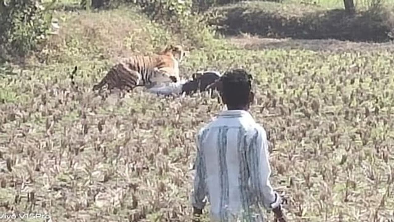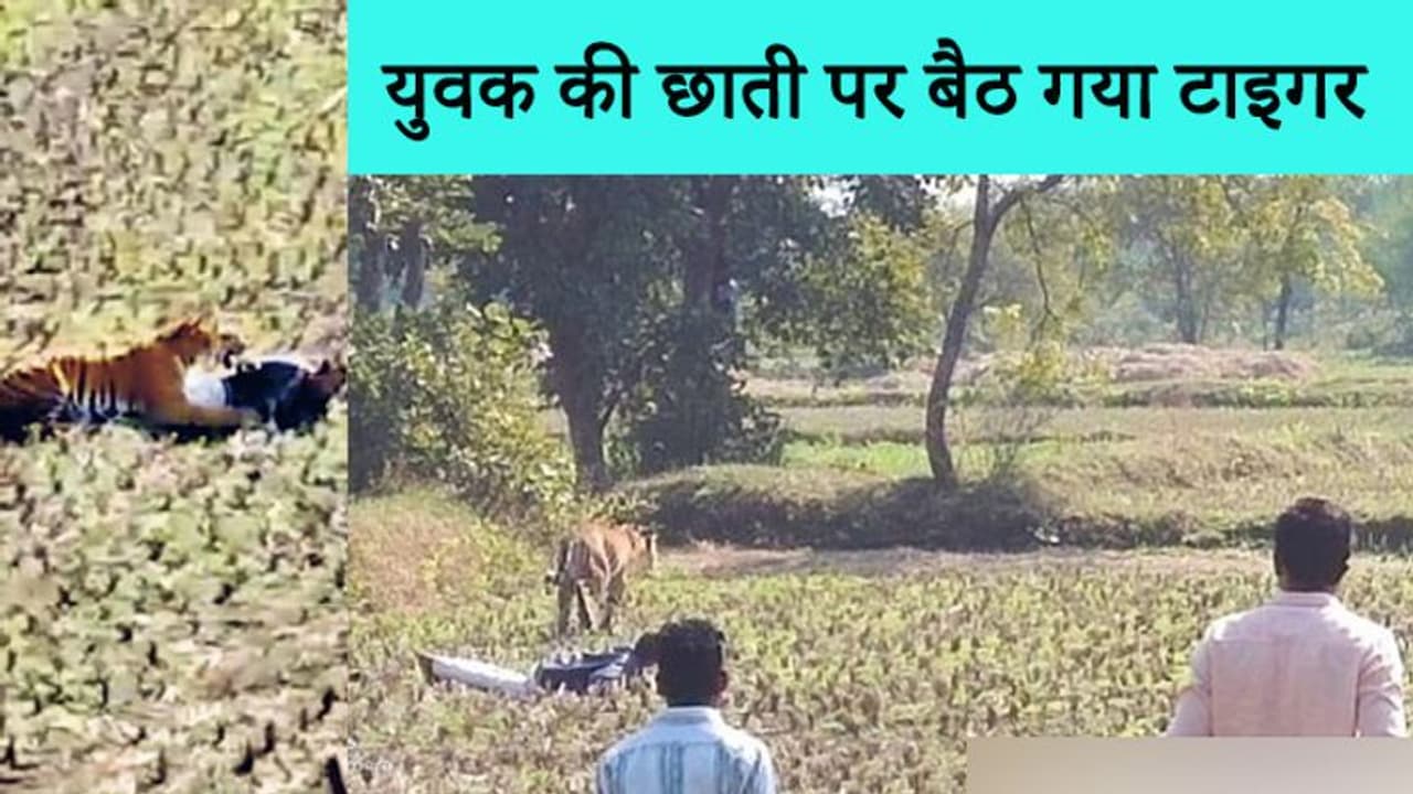 हुआ यूं कि एक टाइगर झाड़ियों में आराम फरमा रहा था। उसी वक्त कुछ लोग वहां से निकले। वे खेत की ओर जा रहे थे। वे आपस में बातचीत करते हुए जा रहे थे। शोरगुल सुनकर टाइगर घबरा गया। वो झाड़ियों से निकलकर जंगल की ओर भागने लगा। इस बीच रास्ते में जा रहे एक युवक को देखकर टाइगर उसकी ओर लपका। इससे पहले कि वो युवक कुछ समझ पाता..टाइगर ने उसे पटक लिया। फिर युवक के ऊपर बैठ गया।