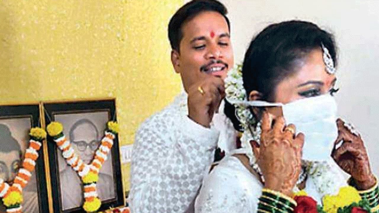 शादी कराने वाले पंडित ने भी अपने चहरे पर मास्क लगा रखा था और बाजू में सेनिटाइजर की बोतल। कमरे में भगवान बुद्ध और बाबा साहेब अंबेडकर की तस्‍वीर के समक्ष जोड़े ने जीवनभर साथ रहने की कसम खाई और पीएम मोदी की अपील को पूरा किया।