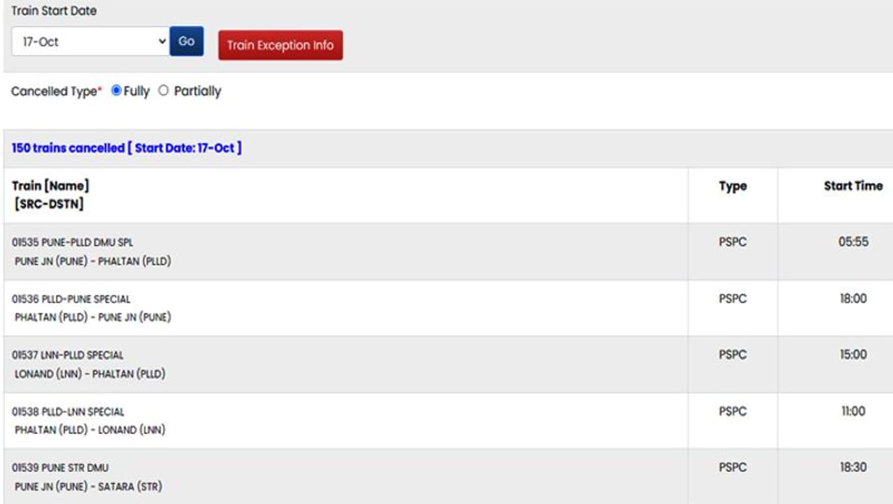5- इसे सिलेक्ट करते ही आपके सामने उस दिन की पूरी तरह कैंसिल और आंशिक रूप से कैंसिल ट्रेनों की लिस्ट सामने आ जाएगी।