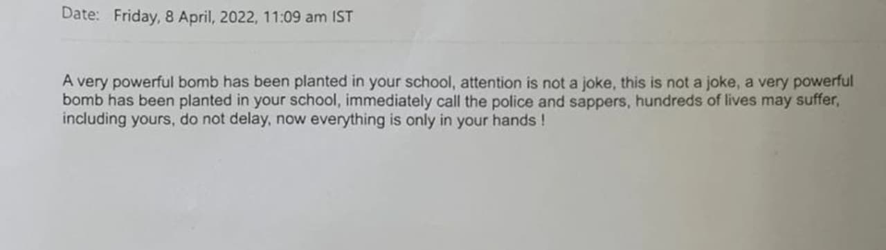 ईमेल में लिखा है, "आपके स्कूल में एक बहुत शक्तिशाली बम लगाया गया है। ध्यान दें, यह कोई मजाक नहीं है। यह कोई मजाक नहीं है। आपके स्कूल में एक बहुत शक्तिशाली बम लगाया गया है। तुरंत पुलिस को बुलाओ। सैकड़ों लोगों की जान जा सकती है। देर मत करो। अब सब कुछ तुम्हारे हाथ में है।”