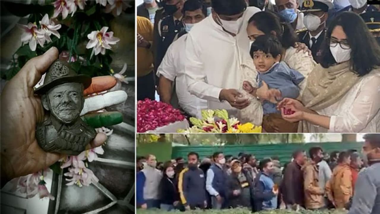 (पहली तस्वीर-धारवाड़ के कलाकार मंजूनाथ हिरेमठ(Manjunath Hiremath) ने अपने तरीके से बिपिन रावत को श्रद्धांजलि दी, दूसरी तस्वीर-CDS जनरल बिपिन रावत और मधुलिका रावत की बेटियां कृतिका और तारिणी ने माता-पिता को अंतिम सम्मान दिया। तीसरी तस्वीर रियल हीरो को अंतिम सलामी देने उमड़ी भीड़)