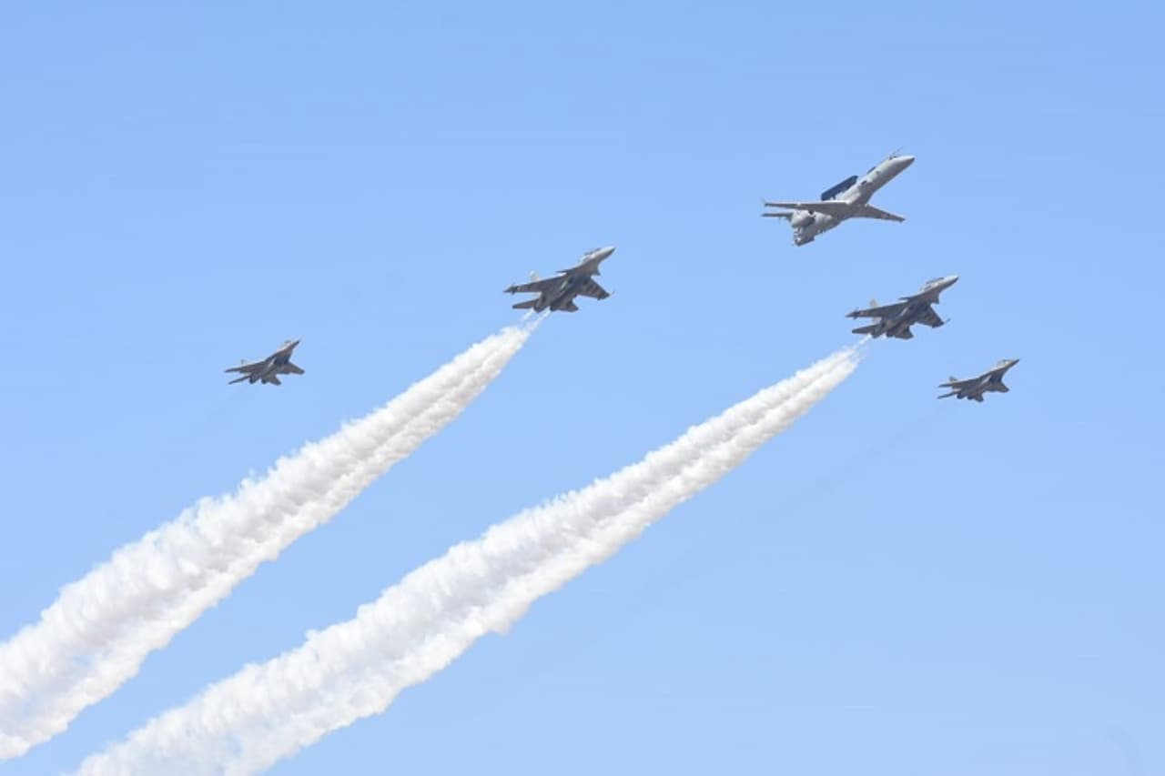 एयरो इंडिया 2023 में भारतीय वायु सेना के लड़ाकू विमान अपनी क्षमता का प्रदर्शन कर रहे हैं। इस तस्वीर में सुखोई एमकेआई 30 विमान भारत द्वारा तैयार किए गए अवाक्स विमान के साथ उड़ान भर रहे हैं।