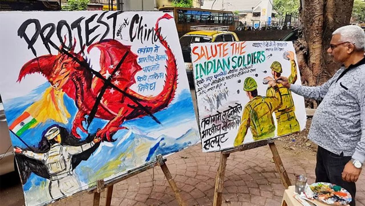 10. मुंबई के गुरुकुल स्कूल ऑफ आर्ट के एक टीचर ने मंगलवार(13 दिसंबर) को अरुणाचल प्रदेश में तवांग के पास वास्तविक नियंत्रण रेखा (एलएसी) पर भारत-चीन संघर्ष का चित्रण करते हुए पेंटिंग बनाई। इसमें भारतीय सेना को सलाम किया गया।