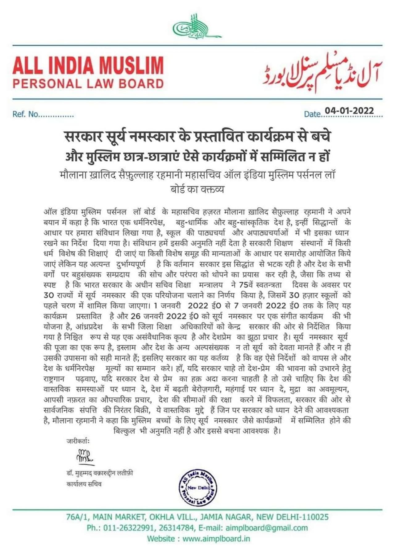 मुस्लिम पर्सनल लॉ बोर्ड के महासचिव मौलाना खालिद सैफुल्लाह रहमानी ने बयान जारी कर कहा कि भारत एक धर्मनिरपेक्ष राष्ट्र है। यहां पर बहुसंख्यक समुदाय के रीति-रिवाज और पूजा पद्धति को सभी धर्मों के ऊपर थोपा नहीं जा सकता है। मौलाना ने सूर्य नमस्कार कार्यक्रम से मुस्लिम छात्र-छात्राओं को दूर रहने की हिदायत दी है। मौलाना ने कहा कि भारतीय संविधान में सभी धर्मों के लोगों को अपने अपने धर्म के अनुसार पूजा-प्रार्थना आदि करने की छूट दी गई है। इसलिए किसी भी धर्म विशेष की पूजा पद्धति को सभी धर्मों के लोगों पर थोपा नहीं जा सकता है। उनका कहना है कि इस्लाम व अन्य धर्मों में सूर्य को देवता मानकर उसकी पूजा करने की अनुमति नहीं है।