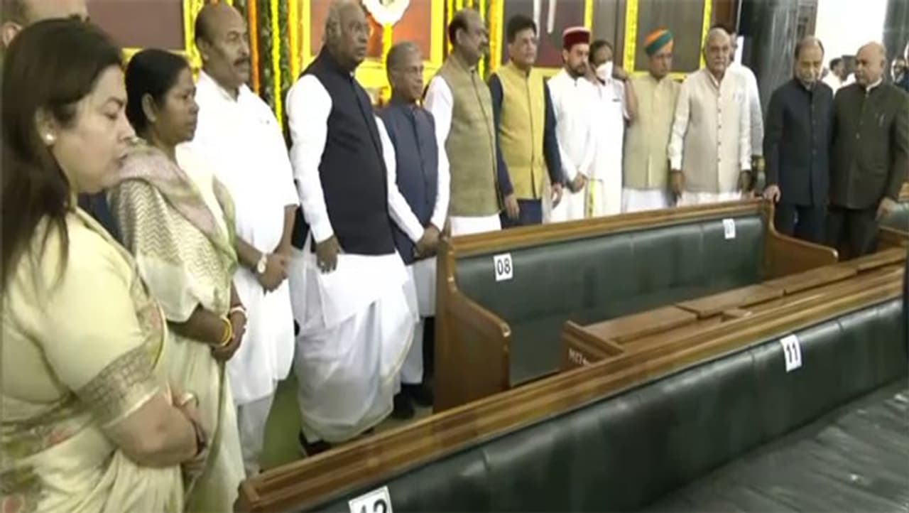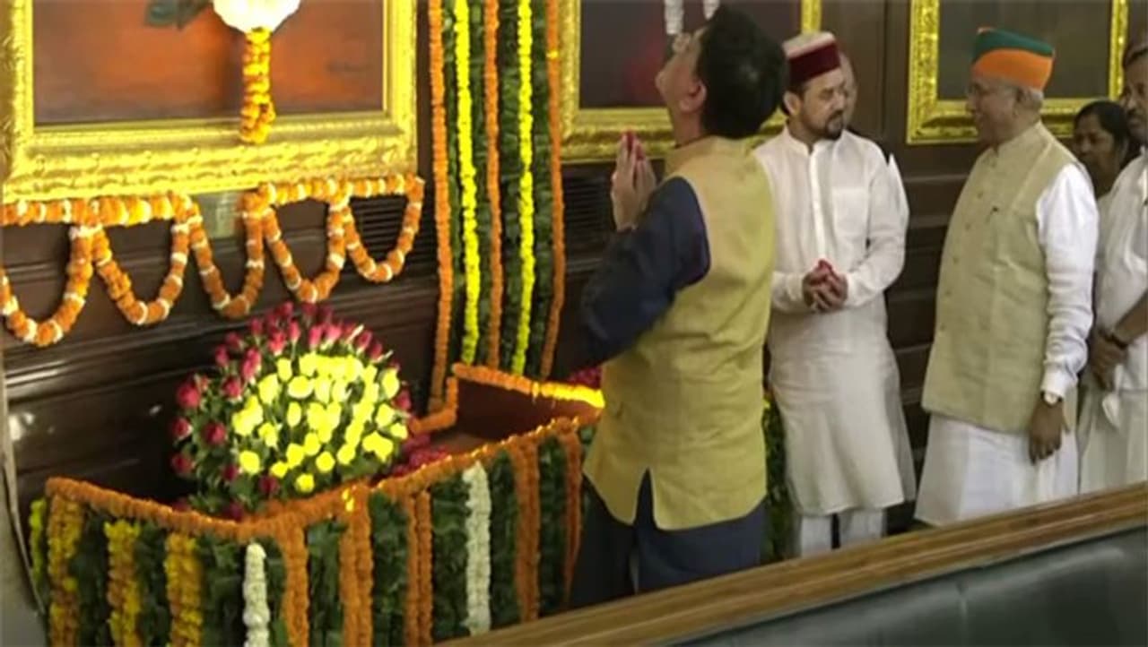 संसद में नेता, मंत्रियों ने अर्पित किए पुष्प