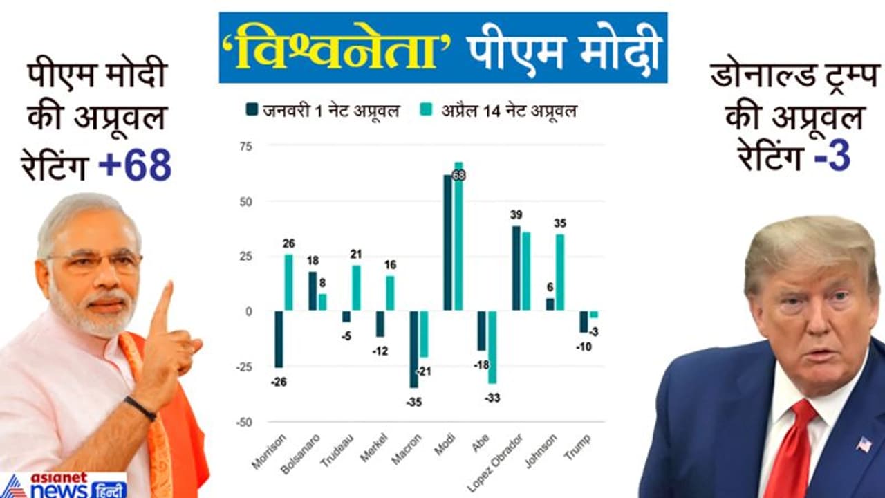 नई दिल्ली. दुनिया में कोरोना महामारी के खिलाफ जंग लड़ने वालों में पीएम मोदी सबसे आगे हैं। यह हम नहीं, बल्कि अमेरिका की ग्लोबल डेटा इंटेलिजेंस कंपनी मॉर्निंग कनसल्ट पॉलिटिकल इंटेलिजेंस ने बताया है। इसके मुताबिक, 14 अप्रैल को पीएम मोदी का 68 अप्रूवल प्वॉइंट्स हैं, जो कि साल की शुरुआत में 62 था। यानी मोदी की लोकप्रियता में 6 प्रतिशत की बढ़ोतरी हुई है। वहीं अमेरिका के राष्ट्रपति डोनाल्ड ट्रम्प को माइनस 3 अप्रूवल रेटिंग मिली है। इस रेटिंग के लिए 1 जनवरी 2020 से 14 अप्रैल 2020 तक लोगों से दुनिया के दूसरे नेताओं से संबंधित सवाल पूछे गए। जैसे की इस संकट की घड़ी में किस नेता ने सबसे अच्छा काम किया है? किस नेता पर कितना भरोसा है? किस नेता की रणनीति उन्हें पसंद आई? हर रोज औसत 447 इंटरव्यू लिए गए।