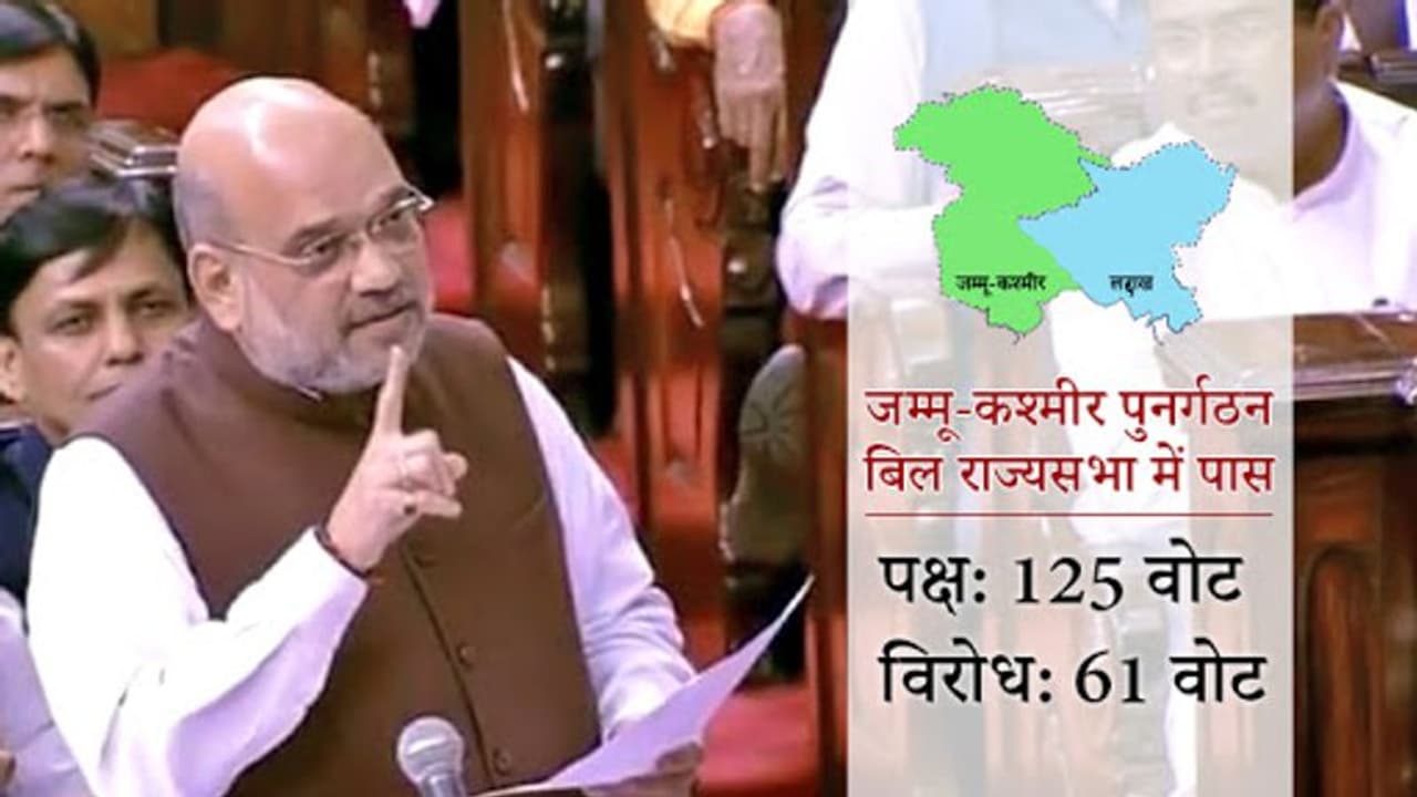 नई दिल्ली. मोदी सरकार ने सोमवार को जम्मू-कश्मीर को विशेष राज्य का दर्जा देने वाले अनुच्छेद 370 को हटा दिया। इसके लिए केंद्रीय गृह मंत्री अमित शाह ने राज्यसभा में अनुच्छेद 370 हटाने का संकल्प पेश किया। राष्ट्रपति ने इसे मंजूर कर दिया। इसके साथ ही राज्य के पुनर्गठन का रास्ता भी साफ हो गया। शाह ने जम्मू-कश्मीर पुनर्गठन विधेयक भी पेश किया। इसके पक्ष में 125 वोट पड़े, विरोध में 61 वोट डाले गए। सरकार अब इसे लोकसभा में पास कराएगी। हालांकि, लोकसभा में यह आसानी से पास हो जाएगा। इससे पहले जम्मू-कश्मीर आरक्षण संसोधन बिल ध्वनिमत के साथ पास हुआ।