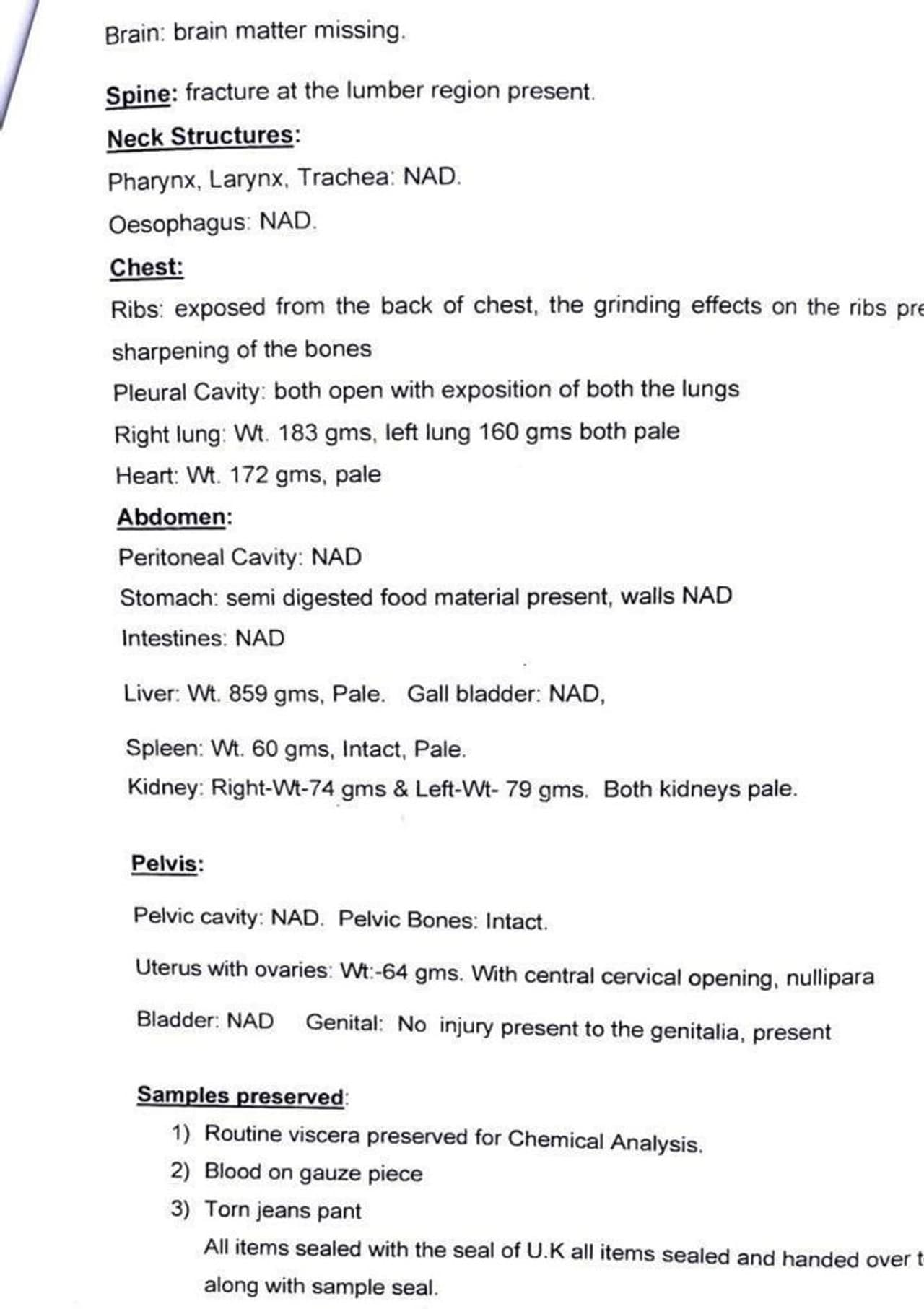 पोस्टमॉर्टम रिपोर्ट के अनुसार स्किन और मांस घिस जाने के चलते पीठ की तरफ से पसली की हड्डियां दिखने लगीं थी। रीढ़ की हड्डी टूट गई थी। फेफड़े बाहर निकल गए थे। पेट में अल्कोहल की मौजूदगी नहीं मिली। अंजली की मौत की वजह सदमा और रक्तस्राव बताया गया है। रिपोर्ट में कहा गया है कि चोटों के चलते उसकी मौत हुई। पोस्टमॉर्टम रिपोर्ट के अनुसार अंजलि को कोई ऐसी चोट नहीं लगी थी जिससे यौन उत्पीड़न का संकेत मिले।