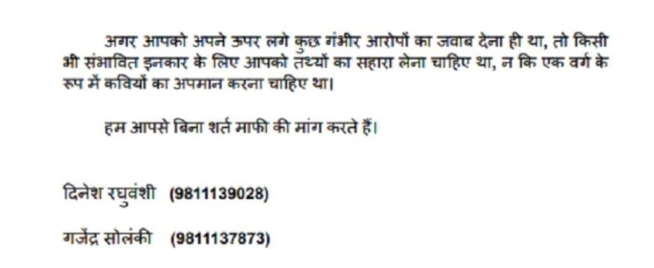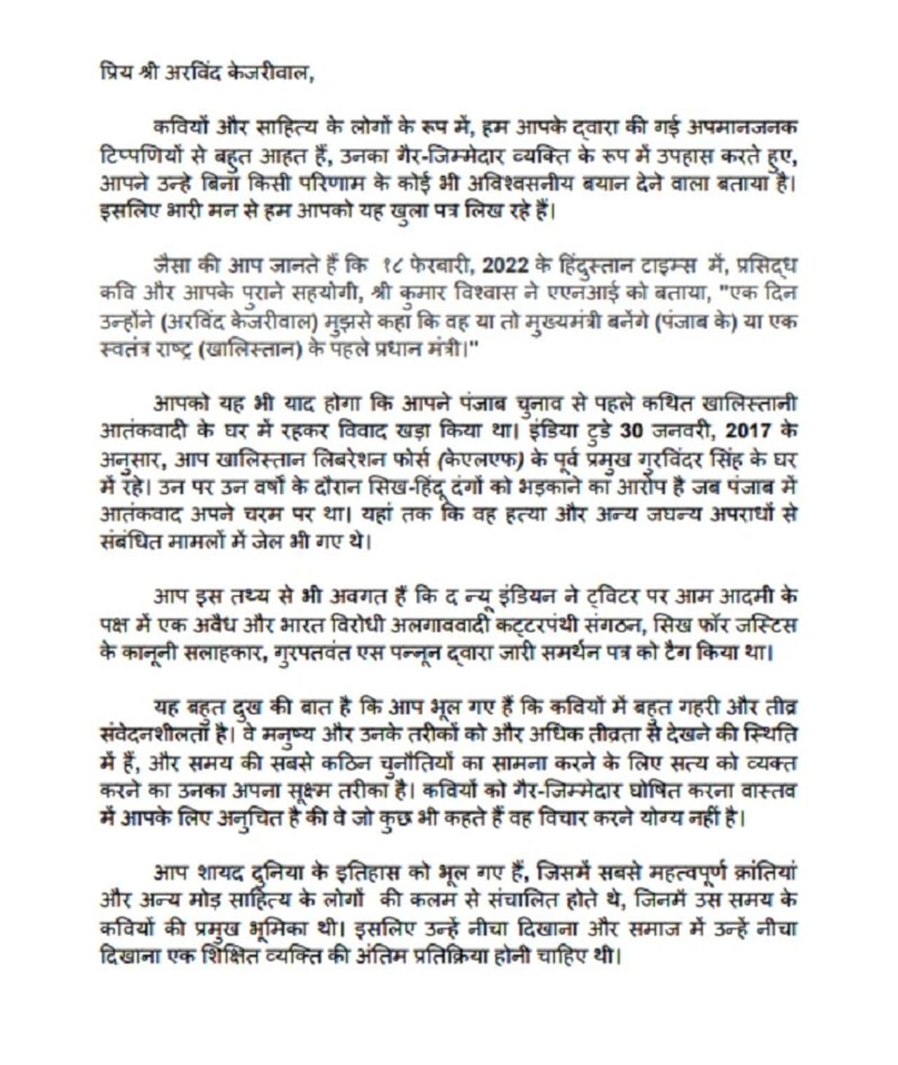 खालिस्तान विवाद मामले में कुमार विश्वास के खिलाफ अरविंद केजरीवाल के बयान से देश के प्रमुख कवि और साहित्यकार नाराज हैं। कवियों और साहित्यकारों ने अरविंद केजरीवाल से माफी की मांग की है।