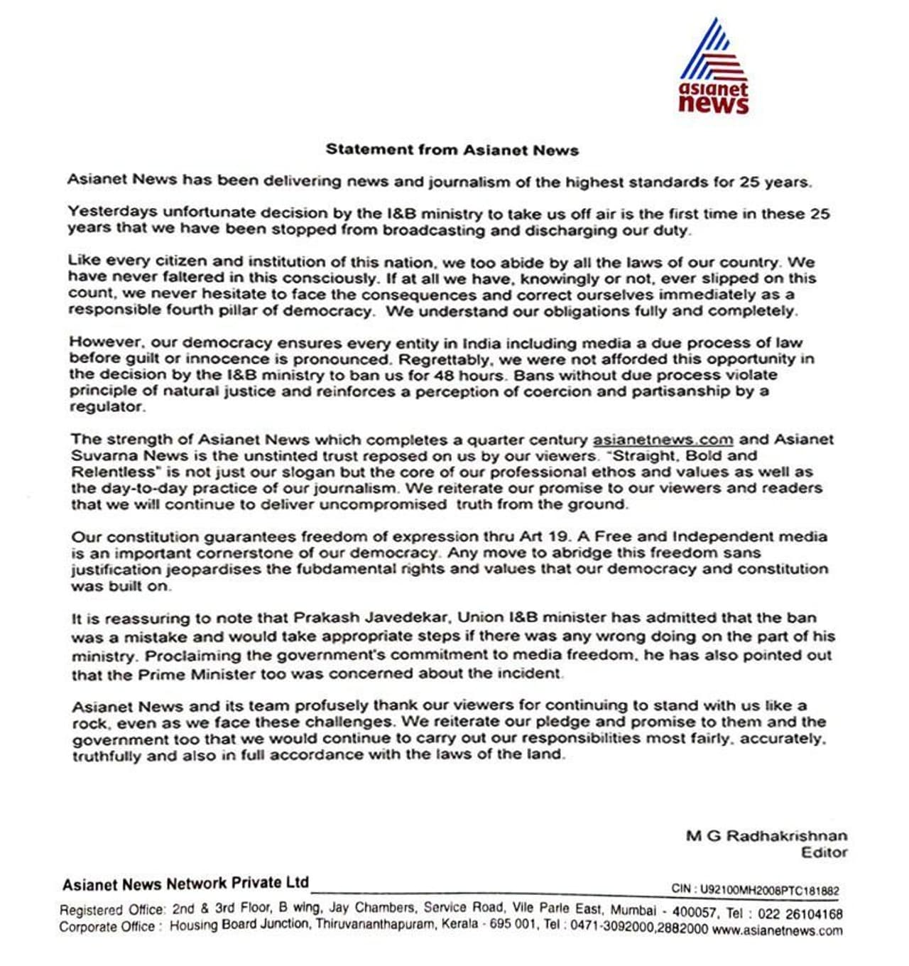 एशियानेट न्यूज पिछले 25 सालों से लगातार उच्चतम दर्जे की पत्रकारिता करता रहा है। शुक्रवार को दुर्भाग्यवश सूचना और प्रसारण मंत्रालय ने पहली बार हमारे चैनल को बैन कर दिया और हमें हमारे कर्तव्यों का निर्वहन करने से वंचित कर दिया गया। देश के आम नागरिक की तरह ही हम भी देश के संविधान का पालन करने के लिए संकल्पित हैं। हमने कभी भी संविधान के खिलाफ जाने की कोशिश नहीं की, पर जाने अनजाने में यदि हमने कोई भी ऐसा काम किया है तो हमें अपनी गलती सुधारने और माफी मांगने में कोई हिचक नहीं है। लोकतंत्र के चौथे स्तंभ के रूप में हम अपनी जिम्मेदारियों और कर्तव्यों को भली भांति समझते हैं।