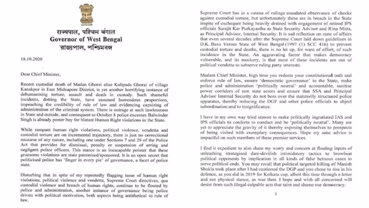 पश्चिम बंगाल के राज्यपाल जगदीप धनखड़ ने रविवार को मुख्यमंत्री ममता बनर्जी को भाजपा कार्यकर्ता मदन घोराई के पुलिस कस्टडी में मौत हो जाने के मामले में पत्र लिखा है। पत्र में उन्होंने कहा है कि मदन की पुलिस कस्टडी में मौत हो जाने से राज्य की जनता में काफी आक्रोश है।
