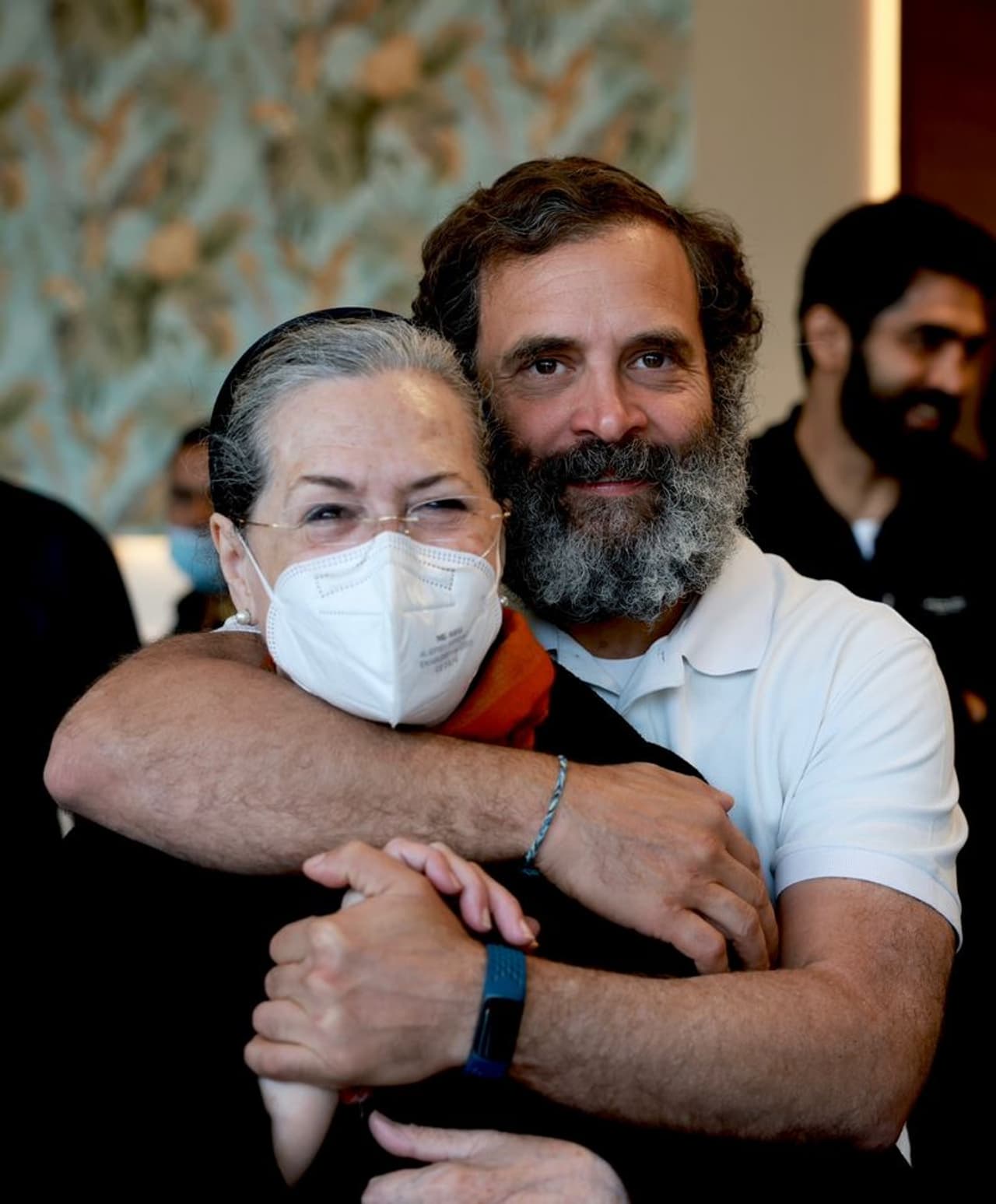 कांग्रेस ने लिखा- देश जोड़ने निकले बेटे से मां की मुलाकात हुई, तो तस्वीरें यूं बनी।