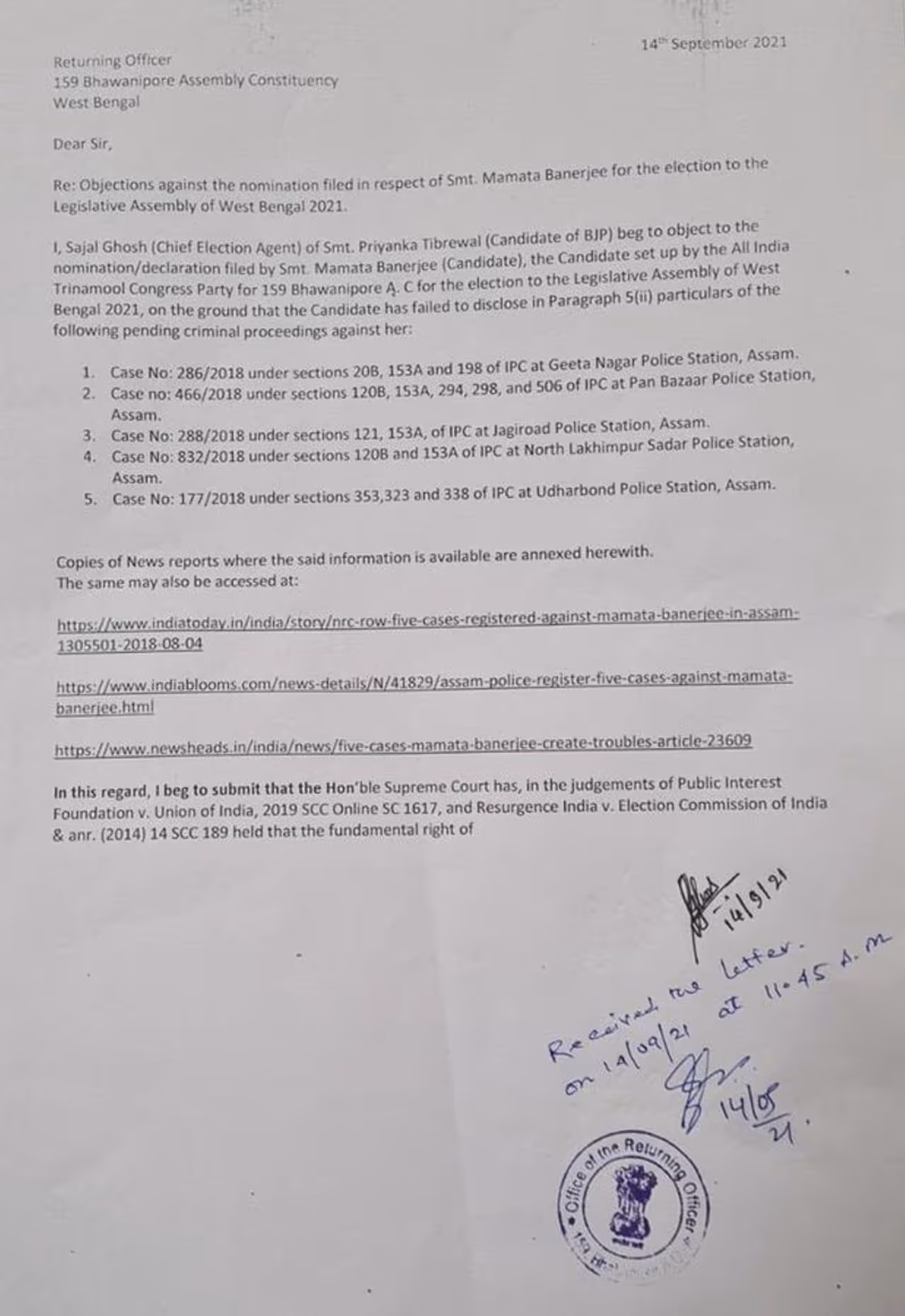 प्रियंका टिबरेवाल (BJP Candidate Priyanka Tibrewal) के मुख्य चुनावी एजेंट सजल घोष (Sajal Ghosh) ने मुख्य चुनाव अधिकारी को इस संबंध में शिकायती पत्र लिखा है। इसमें मांग की गई कि ममता बनर्जी के नामांकन की जांच की जाए। ममता के खिलाफ ये सभी मामले 2018 में असम में दर्ज हुए थे। पत्र में सुप्रीम कोर्ट के निर्देश के अनुसार इस पर कार्रवाई की मांग की है। बता दें कि सुप्रीम कोर्ट ने मार्च 2018 में एक महत्वपूर्ण फैसला देते हुए कहा था कि निर्वाचन अधिकारी संपत्ति या आपराधिक पृष्ठभूमि से संबंधित सूचना का खुलासा नहीं करने पर किसी उम्मीदवार का नामांकन पत्र खारिज कर सकता है।