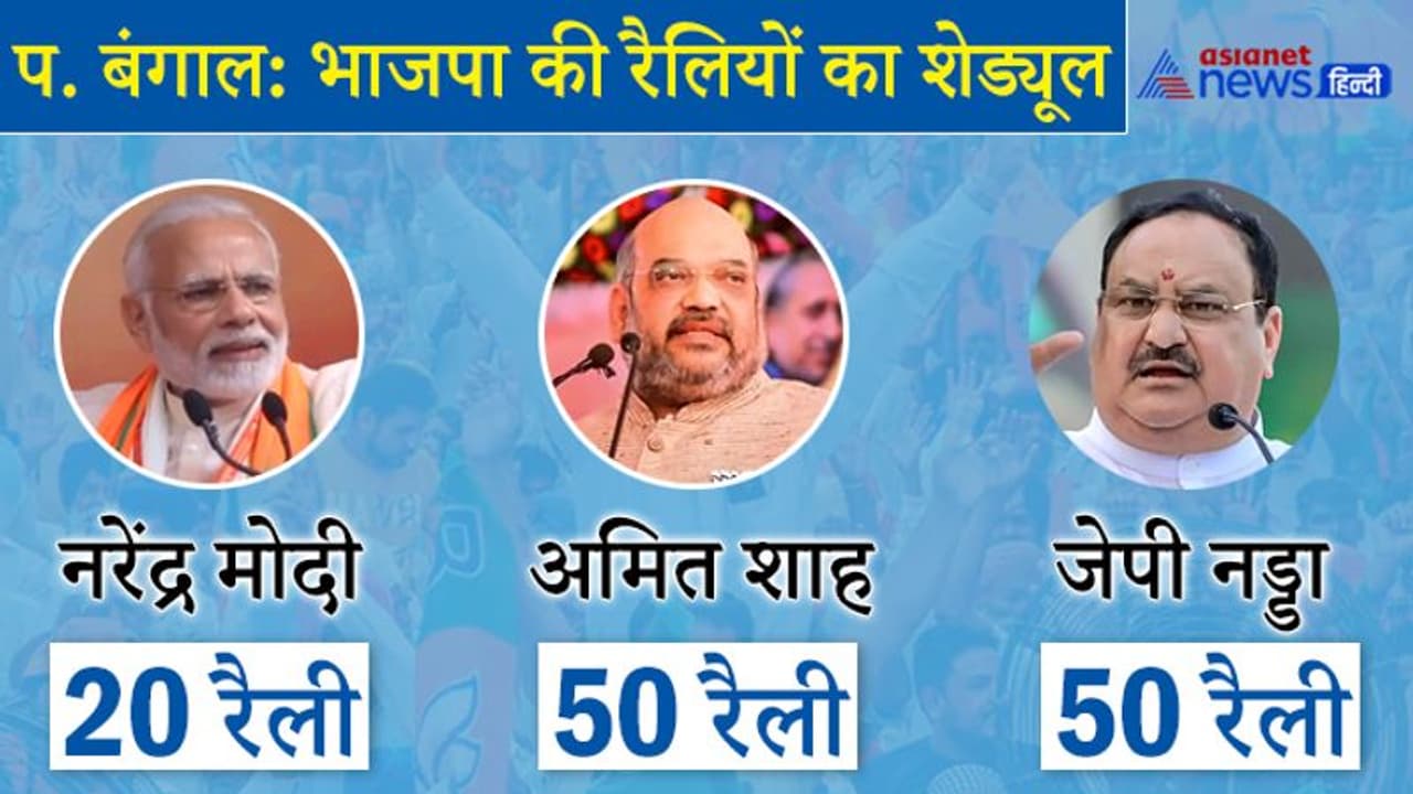 इस बीच खबर है कि पीएम मोदी की पश्चिम बंगाल में 20 और असम में 6 रैलियां हैं। वहीं गृह मंत्री अमित शाह और जेपी नड्डा की करीब 50-50 रैलियों का शेड्यूल है। इसकी शुरुआत 7 मार्च को ब्रिगेड मैदान में मोदी की रैली से होगी। रैली में भाजपा के 10 लाख से ज्यादा कार्यकर्ताओं के जुटने का अनुमान है।