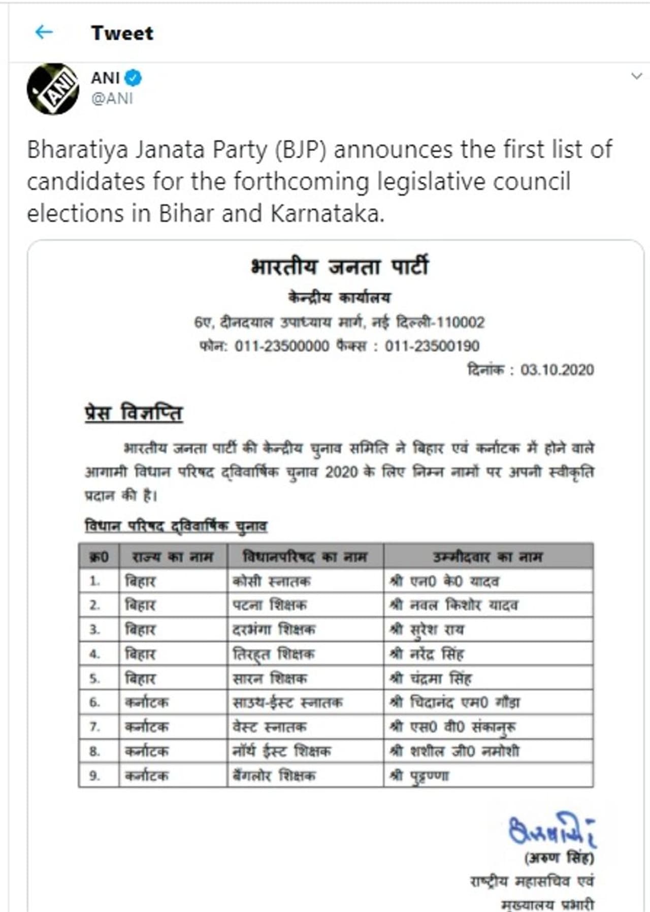 भारतीय जनता पार्टी की केंद्रीय चुनाव समिति ने बिहार और कर्नाटक में होने वाले विधान परिषद चुनाव के लिए उम्मीदवारों की पहली सूची जारी कर दी है।