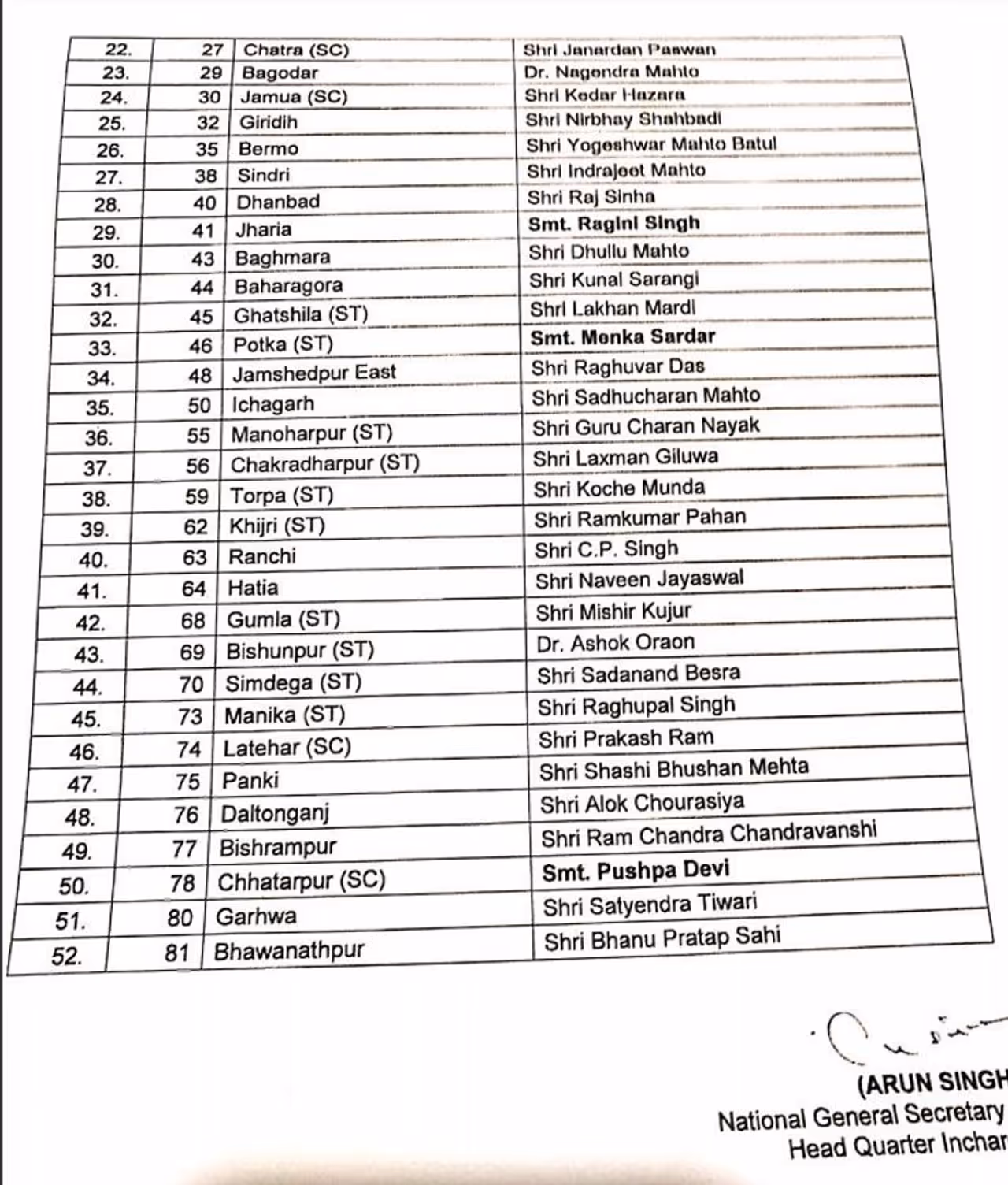 झारखंड विधानसभा चुनाव के लिए भाजपा ने 52 उम्मीदवारों की लिस्ट जारी की है। जमशेदपुर ईस्ट से सीएम रघुवर दास चुनाव लड़ेंगे। पहली लिस्ट में 13 युवा, 17 एसटी, 21 ओबीसी, 5 महिला और 6 एससी उम्मीदा हैं। भाजपा ने कुल 10 मौजूदा विधायकों का टिकट काट दिया है।