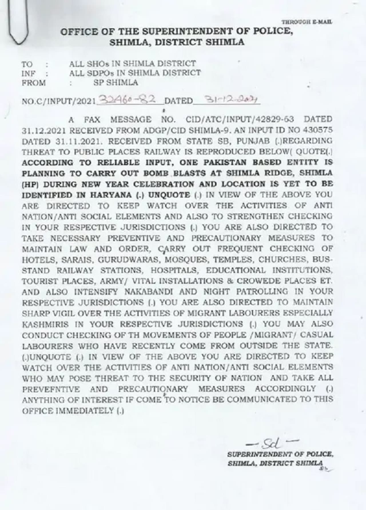 रिज मैदान में शुक्रवार शाम से नए साल का जश्न चल रहा था। हजारों की संख्या में पर्यटक मैदान में जुटे थे। इसी दौरान पाकिस्तान से मिली आतंकी धमकी के बाद एहतियातन जश्न को रोक दिया गया और पुलिस ने मैदान खाली करा दिया।