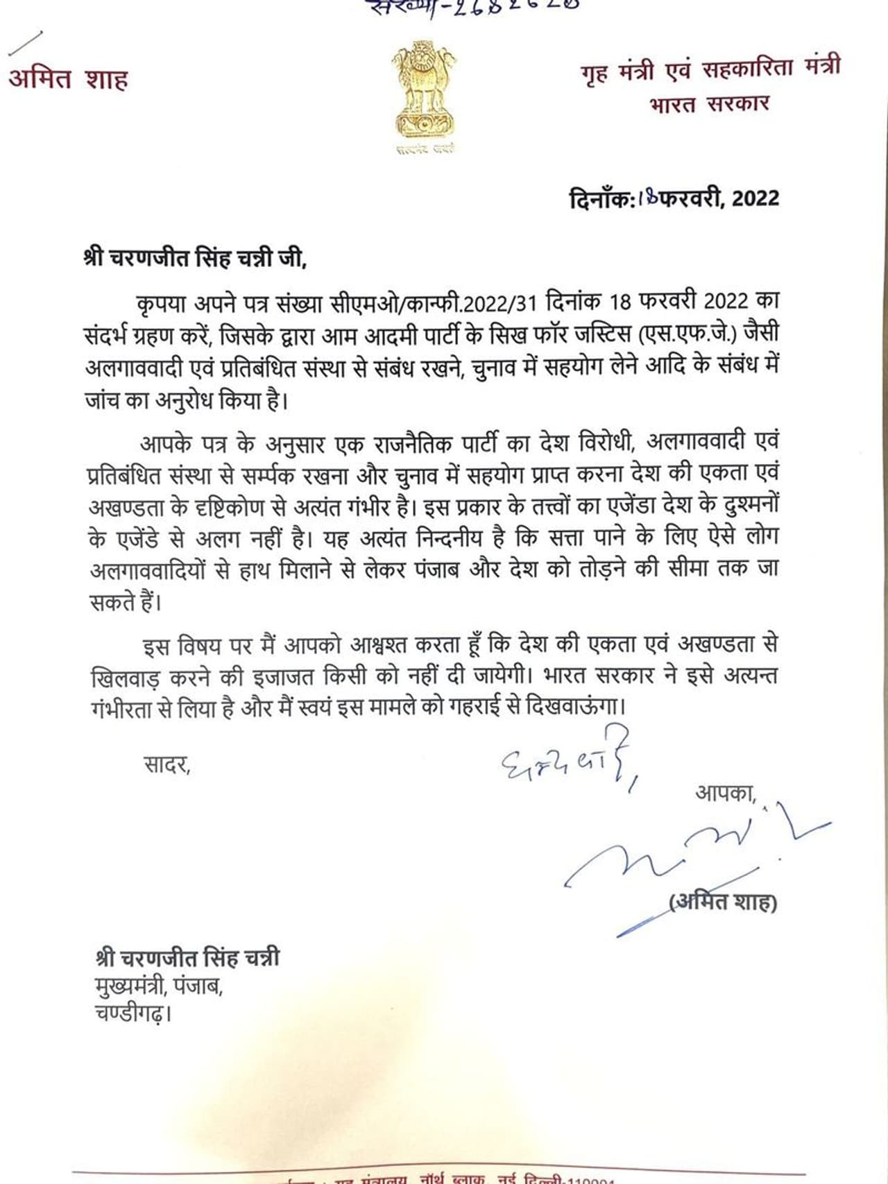 अमित शाह ने पत्र में लिखा, "आपने आम आदमी पार्टी के सिख फॉर जस्टिस (SFJ) जैसी अलगाववादी और प्रतिबंधित संस्था से संबंध रखने, चुनाव में सहयोग लेने आदि के संबंध में जांच का अनुरोध किया है। आपके पत्र के अनुसार एक राजनैतिक पार्टी का देश विरोधी, अलगाववादी और प्रतिबंधित संस्था से संपर्क रखना और चुनाव में सहयोग प्राप्त करना देश की एकता और अखण्डता के दृष्टिकोण से अत्यंत गंभीर है। यह अत्यंत निन्दनीय है कि सत्ता पाने के लिए ऐसे लोग अलगाववादियों से हाथ मिलाने से लेकर पंजाब और देश को तोड़ने की सीमा तक जा सकते हैं।"
