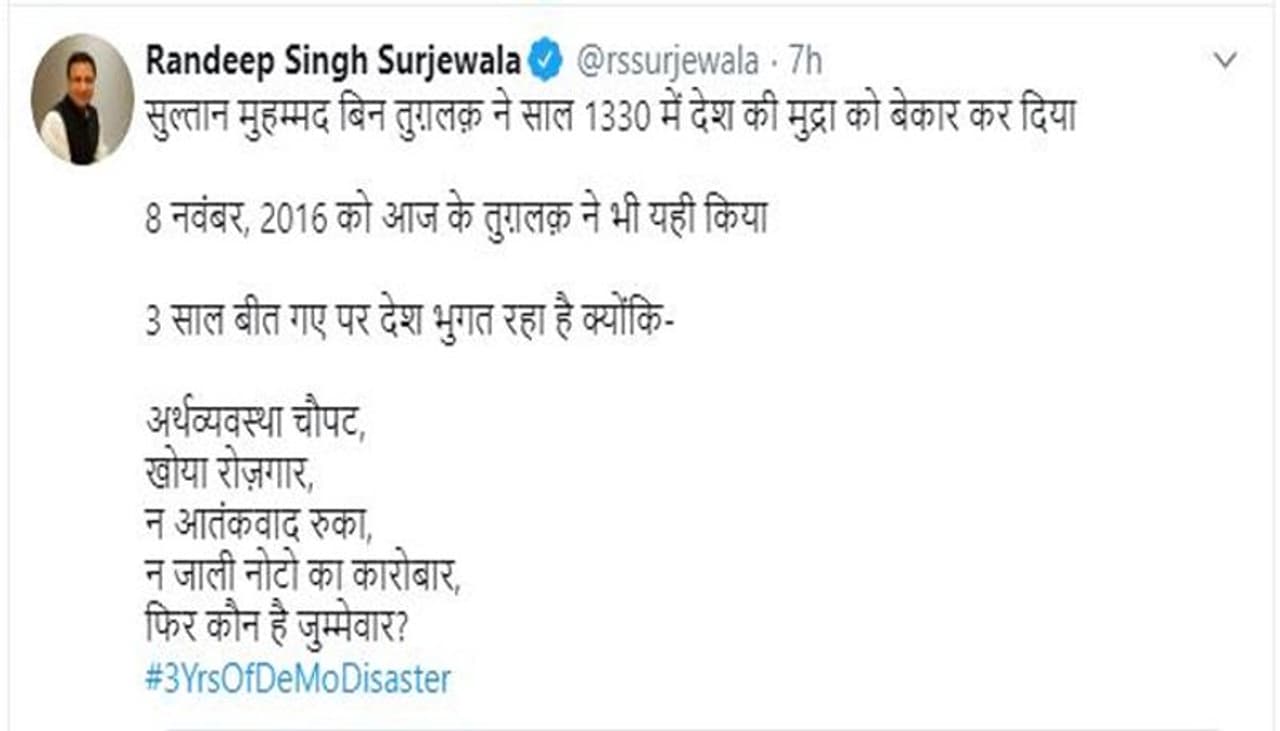कांग्रेस के प्रमुख प्रवक्ता रणदीप सुरजेवाला ने भी नोटबंदी को लेकर प्रधानमंत्री मोदी पर निशाना साधा और उन्हें “आज का तुगलक” कहा। उन्होंने ट्वीट किया, “सुल्तान मोहम्मद बिन तुगलक ने 1330 में देश की मुद्रा को अमान्य करार दिया था। आज के तुगलक ने भी आठ नवंबर, 2016 को यही किया था।” उन्होंने कहा, “तीन साल गुजर गए और देश भुगत रहा है क्योंकि अर्थव्यवस्था ठप हो चुकी है, रोजगार छिन गया है। न ही आतंकवाद रुका और न ही जाली नोटों का कारोबार थमा है।” सुरजेवाला ने पूछा कि इसके लिए जिम्मेदार कौन है।