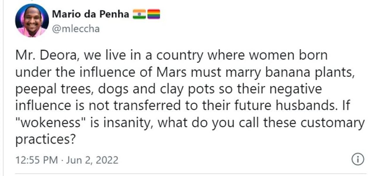 कुछ ट्विटर यूजर ने इस ट्वीट के लिए देवड़ा की आलोचना की। मारियो दा पेन्हा नाम के व्यक्ति ने कहा कि हम एक ऐसे देश में रहते हैं जहां मंगल के प्रभाव में पैदा हुई महिलाओं की शादी केले के पौधे, पीपल के पेड़, कुत्ते और मिट्टी के बर्तन से कराई जाती है ताकि उसका नकारात्मक प्रभाव उनके भावी पति पर नहीं पड़े। यदि 'जागना' पागलपन है तो आप इन प्रथागत प्रथाओं को क्या कहते हैं?