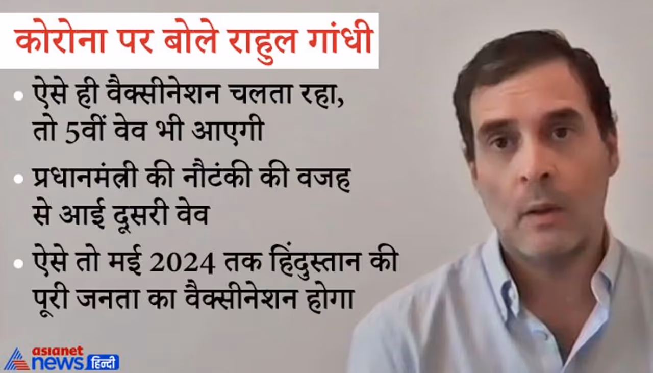 सरकार और प्रधानमंत्री को आज तक कोरोना समझ ही नहीं आया है। कोरोना सिर्फ एक बीमारी नहीं है, कोरोना एक बदलती हुई बीमारी है। आप इसको जितना समय और जगह देंगे ये उतना खतरनाक बनता जाएगा। अगर इस रेट पर वैक्सीनेशन चलता गया तो तीसरी, चौथी और पांचवीं वेव आएगी। हमारी मृत्यु दर झूठ है और सरकार इस झूठ को फैला रही है। सरकार को समझना चाहिए कि विपक्ष उनका दुश्मन नहीं है, विपक्ष उनको रास्ता दिखा रहा है। ये दूसरी वेव प्रधानमंत्री की ज़िम्मेदारी है, प्रधानमंत्री ने जो नौटंकी की, अपनी ज़िम्मेदारी पूरी नहीं की उसका कारण दूसरी वेव है। अगर वैक्सीनेशन इसी तरह से चलता गया तो मई 2024 में हिन्दुस्तान की पूरी जनता का वैक्सीनेशन होगा। उनका इशारा लोकसभा चुनाव काे लेकर था। अगला चुनाव मई, 2024 के आसपास आएगा। हमने कोविड को लेकर बार-बर भारत सरकार को चेतावनी दी थी। बाद में पीएम मोदी ने COVID19 के खिलाफ भारत की जीत का इजहार कर दिया। यह एक उभरती हुई बीमारी है। लॉकडाउन और मास्क पहनना अस्थायी समाधान है, वैक्सीन से ही इसे हराया जा सकता है।