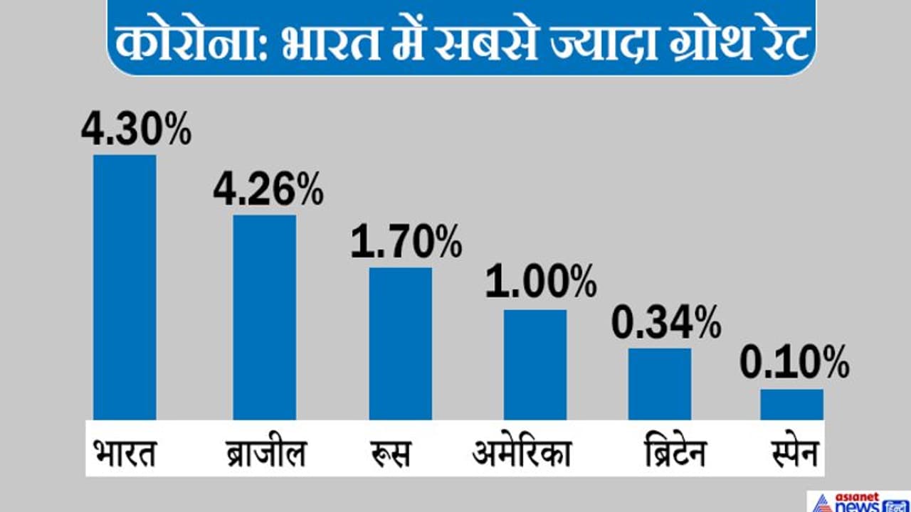 भारत में टॉप 6 देशों में कोरोना केसों के मामले में ग्रोथ रेट सबसे ज्यादा है। यहां संक्रमितों की संख्या 4.3% तक पहुंच गई है। जबकि ब्राजील में 4.26% की ग्रोथ रेट है। सबसे कम ग्रोथ रेट स्पेन का है। यहां संक्रमितों की संख्या 0.10% की दर से बढ़ रही है। ये आंकड़े WHO यानी, विश्व स्वास्थ्य संगठन ने जारी किए हैं।