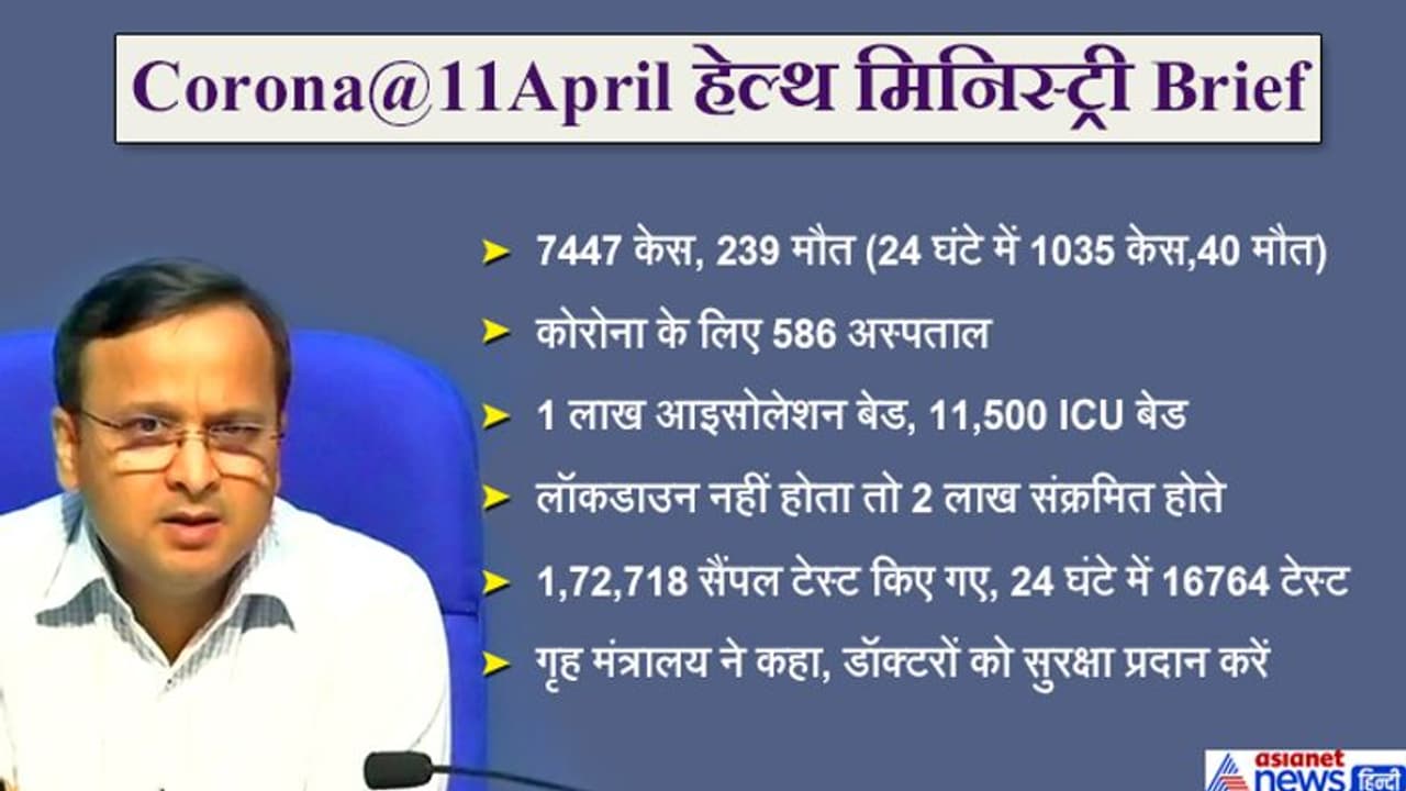 नई दिल्ली. भारत में कोरोना के 7447 संक्रमित मरीज सामने आ चुके हैं। स्वास्थ्य मंत्रालय के संयुक्त सचिव लव अग्रवाल ने बताया, अब तक 642 लोग ठीक हो चुके हैं। कल 1035 नए मामले सामने आए हैं, जिससे देशभर में कुल मामले बढ़कर 7447 हो गई है। कल 40 नई मौतें हुए हैं जिससे मरने वालो की संख्या बढ़कर 239 मौतें हो चुकी हैं।