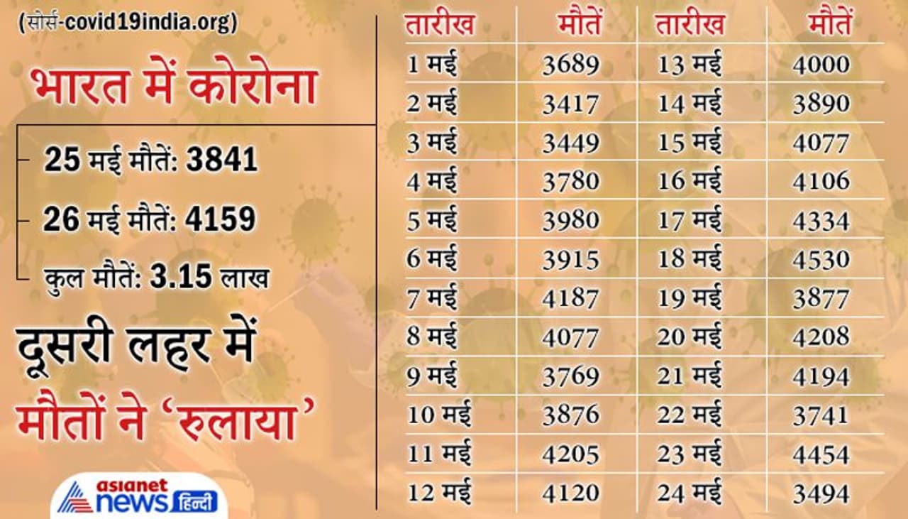 नई दिल्ली. कोरोना संक्रमण की दूसरी लहर में काफी उतार-चढ़ाव देखने को मिल रहे हैं। नए केस बेशक लंबी छलांग नहीं मार रहे, लेकिन मौतों का आंकड़ा अभी भी 4000 के आसपास ही जा रहा है। पिछले 3 दिन में 16000 नए केस मिले। 24 मई को 1.95 लाख केस मिले थे, जबकि 25 मई को 2.08 लाख। अब पिछले 24 घंटे में 2.11 लाख नए केस मिले हैं। इस दौरान रिकवरी में भी मामूली उतार देखा गया। 25 मई को 2.95 लाख लोग ठीक हुए थे, जबकि पिछले 24 घंटे में 2.82 लाख लोग रिकवर हुए। देश में अब तक 2.73 करोड़ से अधिक लोग कोरोना संक्रमित हो चुके हैं। इस समय देश में 24 लाख से अधिक एक्टिव केस हैं, जबकि अब तक 2.46 करोड़ लोग ठीक हो चुके हैं। देश में अब तक 3.15 लाख मौतें हो चुकी हैं।