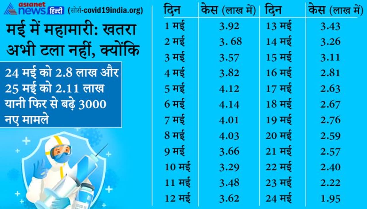 भारत में कोरोना के मामलों में अभी भी मामूली उतार-चढ़ाव देखा जा रहा है। पिछले 3 दिन में 16000 नए केस मिले। 24 मई को 1.95 लाख केस मिले थे, जबकि 25 मई को 2.08 लाख। अब पिछले 24 घंटे में 2.11 लाख नए केस मिले हैं। इस दौरान रिकवरी में भी मामूली उतार देखा गया। 25 मई को 2.95 लाख लोग ठीक हुए थे, जबकि पिछले 24 घंटे में 2.82 लाख लोग रिकवर हुए। जानिए कोरोना से जुड़ा नया आंकड़ा...