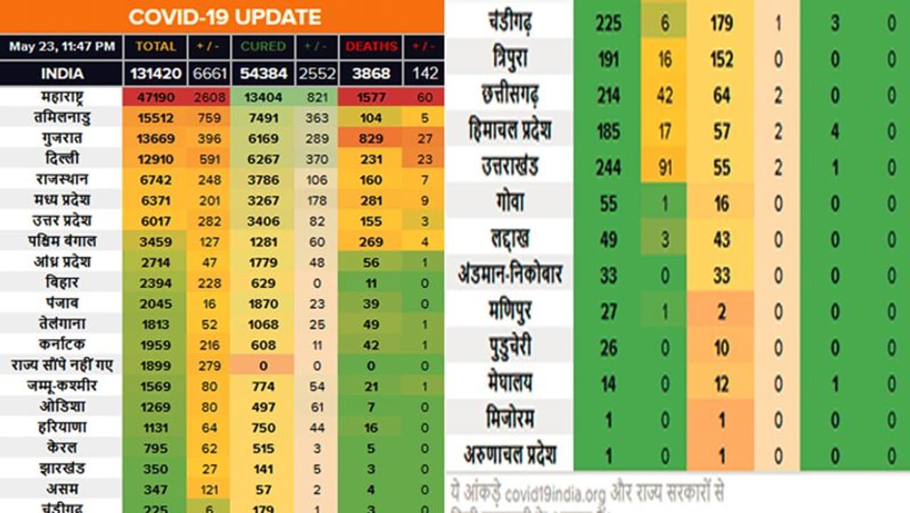 महाराष्ट्र- संक्रमित- 47190: यहां, शनिवार को 2608 नए मरीज मिले, जबकि 60 लोगों की मौत हुई। राज्य में मृतकों का आंकड़ा 1577 पहुंच गया है। वहीं, शनिवार को 821 मरीज स्वस्थ होकर घर लौटे। अब तक राज्य में 13 हजार 404 संक्रमित ठीक हुए हैं।