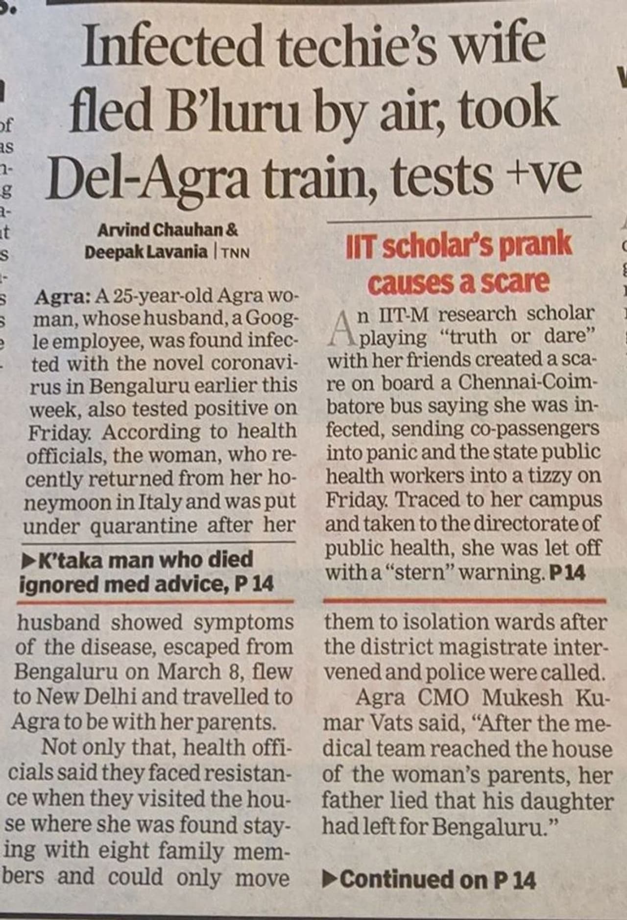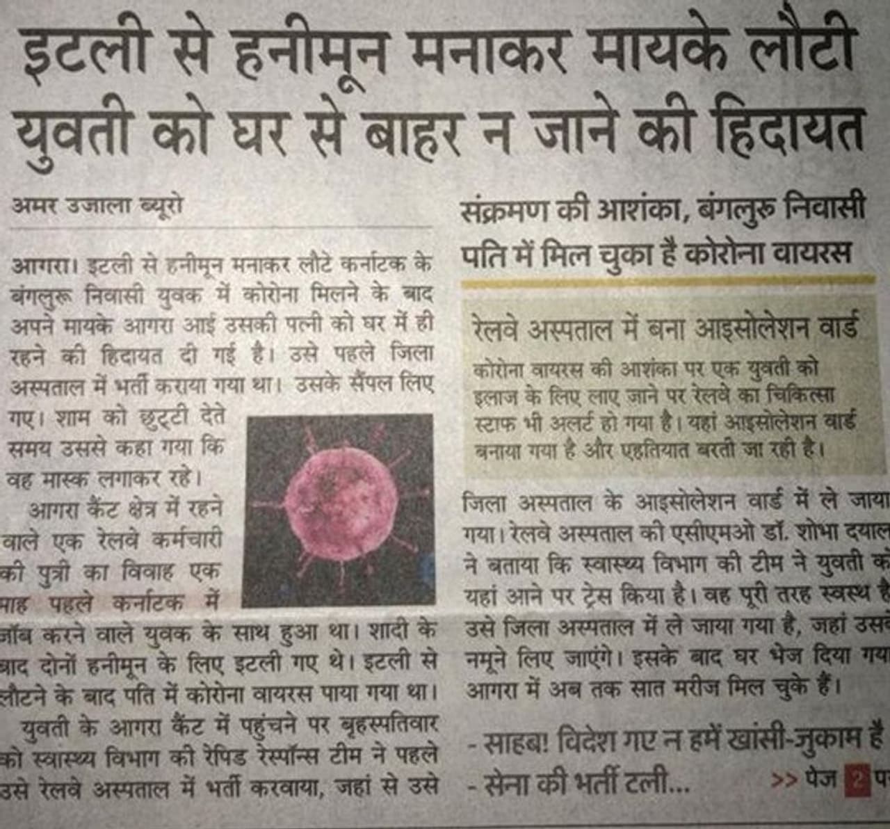 खबरों में कहा गया कि हनीमून मनाने गए शख्स की पत्नी बेंगलुरू से फ्लाइट पकड़कर आगरा भाग गई थी। वहीं जब पता चला कि ये लोग कोरोना से संक्रमित हैं तो ये आगरा में एक अस्पताल से भाग गए। इन खबरों में कोई भी सच्चाई नहीं है महिला बेंगलुरू से आगरा अपने मायके होली मिलने के लिए गई थी। वहीं आगरा के अपस्ताल में स्वास्थ्य सुविधाओं की खस्ता हालात देख उन्होंने वहां इलाज करवाना उचित नहीं समझा। वे 6 मार्च को मुंबई आए और 8 मार्च को होली मनाने महिला मायके आगरा गई।