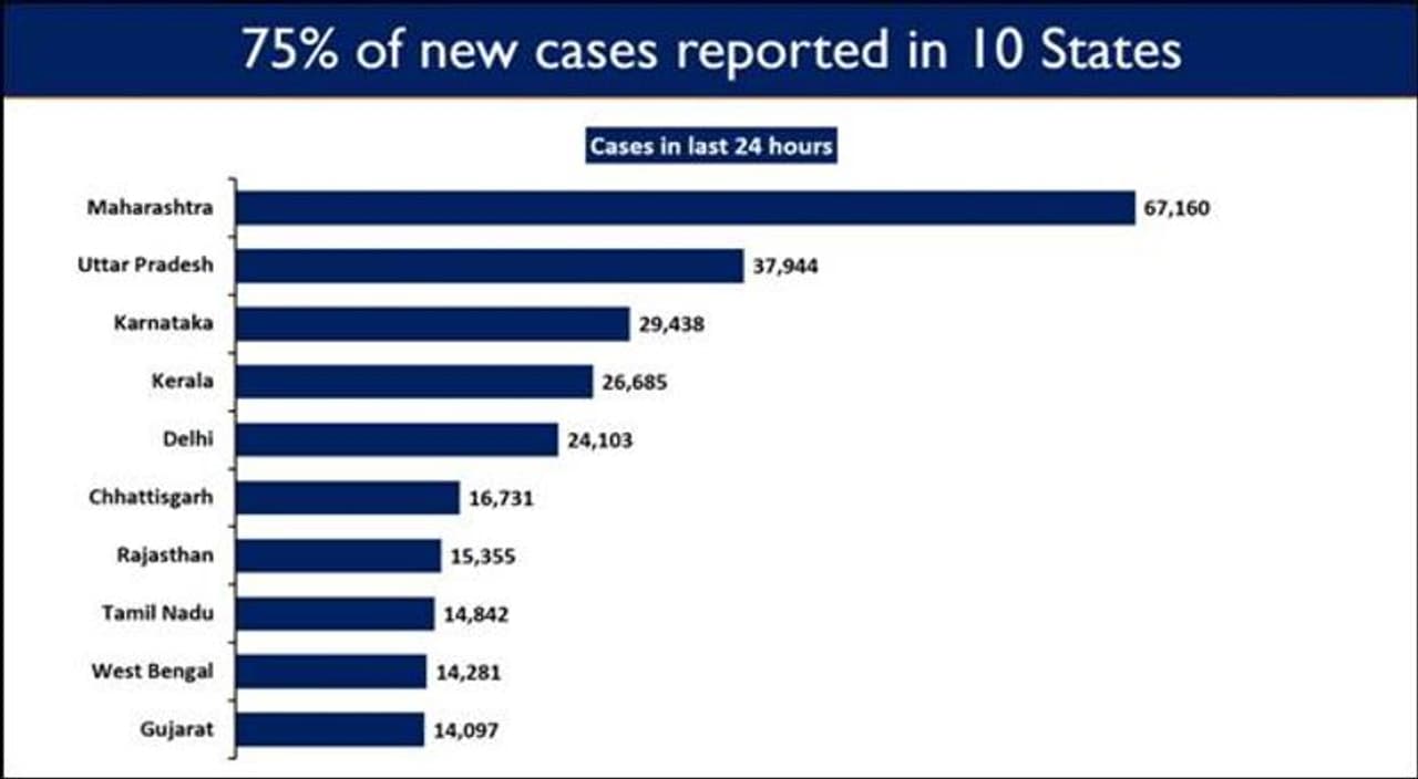 महाराष्ट्र, उत्तर प्रदेश, दिल्ली, कर्नाटक, केरल, छत्तीसगढ़, पश्चिम बंगाल, तमिलनाडु, गुजरात और राजस्थान सहित 10 राज्यों में नये संक्रमण के 74.53 प्रतिशत मामले दर्ज किए जा रहे हैं। पिछले 24 घंटों में महाराष्ट्र में सबसे अधिक 67,160 नए मामले दर्ज किए गए हैं। 37,944 मामलों के साथ उत्तर प्रदेश दूसरे स्थान पर है, जबकि कर्नाटक में 29,438 नए मामले सामने आए हैं।
