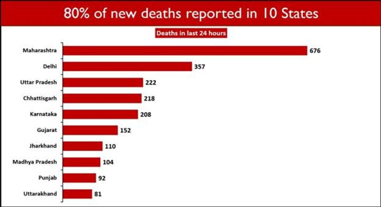 कोविड से जुड़ी राष्ट्रीय मृत्यु दर तेजी से कम हुई है। इस समय 1.13 प्रतिशत है। पिछले 24 घंटों के दौरान 2,767 कोविड मरीजों की मौत हुई है। 10 राज्यों का मौत के नए मामलों में 80.23 प्रतिशत योगदान है। महाराष्ट्र में सबसे अधिक 676 लोगों की जान गई, इसके बाद दिल्ली में सबसे ज्यादा 357 लोगों की मौत हुई। तीसरे नंबर पर उत्तर प्रदेश है जहां पिछले 24 घंटे में 222 मौतें दर्ज की गई हैं।