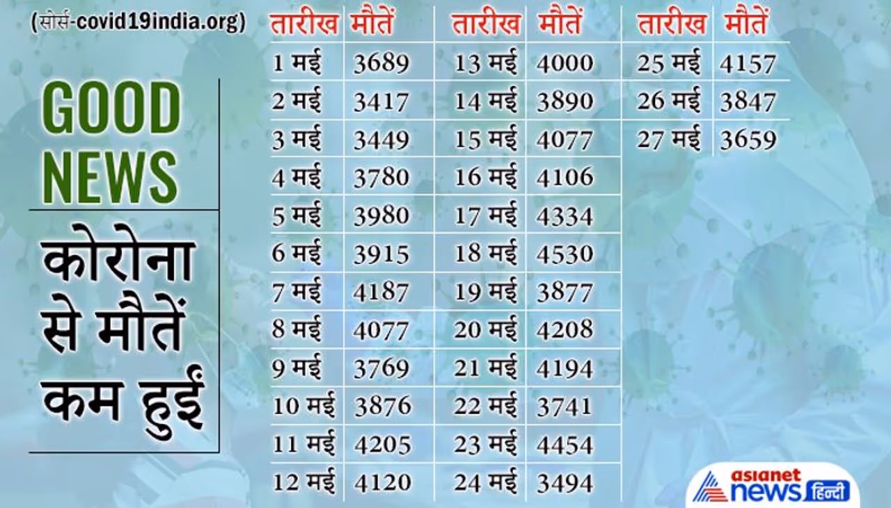 नई दिल्ली. यह देश और कई राज्यों के लिए राहत की खबर है कि कोरोना संक्रमण की दूसरी लहर उतार पर दिख रही है। जिन राज्यों में पहले स्थिति भयावह थी, वहां अब मामूली केस आ रहे हैं। मई में ऐसा दूसरी बार हुआ है, जब नए केस 2 लाख से कम मिले हैं। पिछले 24 घंटे में 1.79 लाख केस मिले हैं, जबकि ठीक होने वालों की संख्या 2.64 लाख है। इससे पहले 24 मई को 1.95 लाख केस मिले थे। मौतें भी तीन दिन बाद थोड़ी कम हुई हैं। पिछले 24 घंटे में 3659 मौतें हुई हैं। जबकि 25 मई को 4157 और 26 मई को 3847 मौतें हुई थीं(यह संख्या अपडेट होने के बाद ऊपर-नीचे होती है)। देश में अब तक 3.18 लाख मौतें हो चुकी हैं। देश में अब तक 2.75 करोड़ लोग संक्रमित हो चुके हैं। इनमें से 2.48 करोड़ ठीक हो चुके हैं। इस समय 23.27 लाख एक्टिव केस हैं।