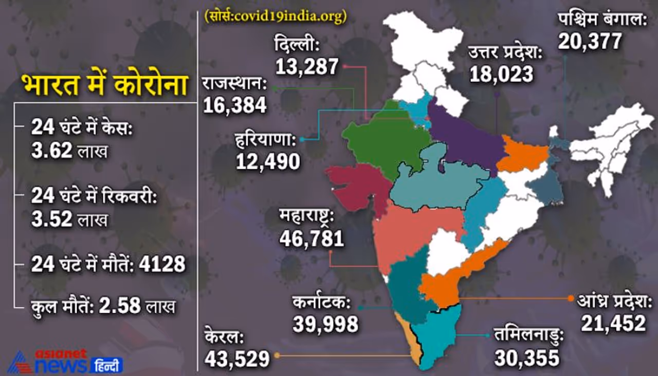 नई दिल्ली. देश में कोरोना संक्रमण की स्पीड और मौतों पर अभी नियंत्रण नहीं हो सका है। लेकिन यह अच्छी बात है कि रिकवरी लगातार 3.50 लाख के आसपास जा रही है। भारत में लगातार दूसरे दिन कोरोना संक्रमण के केस बढ़ गए हैं। पिछले 24 घंटे में 3.62 लाख केस मिले हैं, जबकि 11 मई को 3.48 लाख केस मिले थे। इससे पहले 9 और 10 मई को मामलों में गिरावट आई थी। 30 अप्रैल को पहली बार 4 लाख के ऊपर मामले सामने आए थे। मई में अब तक सबसे कम मामले 10 मई को 3.29 लाख आए थे। जहां तक रिकवरी की बात है कि 8 मई को सबसे अधिक 3.94 लाख लोग ठीक हुए थे। चिंता की बात यह है कि मौतों पर विराम नहीं लग पा रहा है। मई के 12 दिनों में 46000 से अधिक लोगों की मौत हुई है। देश में अब तक 2,58,353 लोगों की मौत हुई है। मौतों के मामले में भारत अमेरिका और ब्राजील के बाद तीसरा देश बना हुआ है। अगर पिछले एक दिन का आंकड़ा देखें, तो भारत में 4128 लोगों की मौत हुई है।