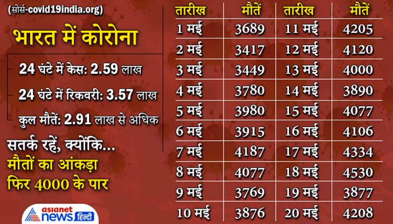 देश में कोरोना के मामलों में रिकॉर्ड गिरावट आई है। मई में अब तक का सबसे कम आंकड़ा मिला है। पिछले 24 घंटे में 2.59 लाख केस मिले हैं, जबकि 3.57 लाख लोग ठीक हुए। लेकिन मौतों के मामले में भी अभी भी डर बना हुआ है। एक बार फिर मौतें 4000 को पार कर गईं। जहां तक रिकवरी की बात है, तो यह अच्छी खबर है कि पिछले 12 दिनों में देश में 7.19 लाख एक्टिव केस कम हुए हैं।