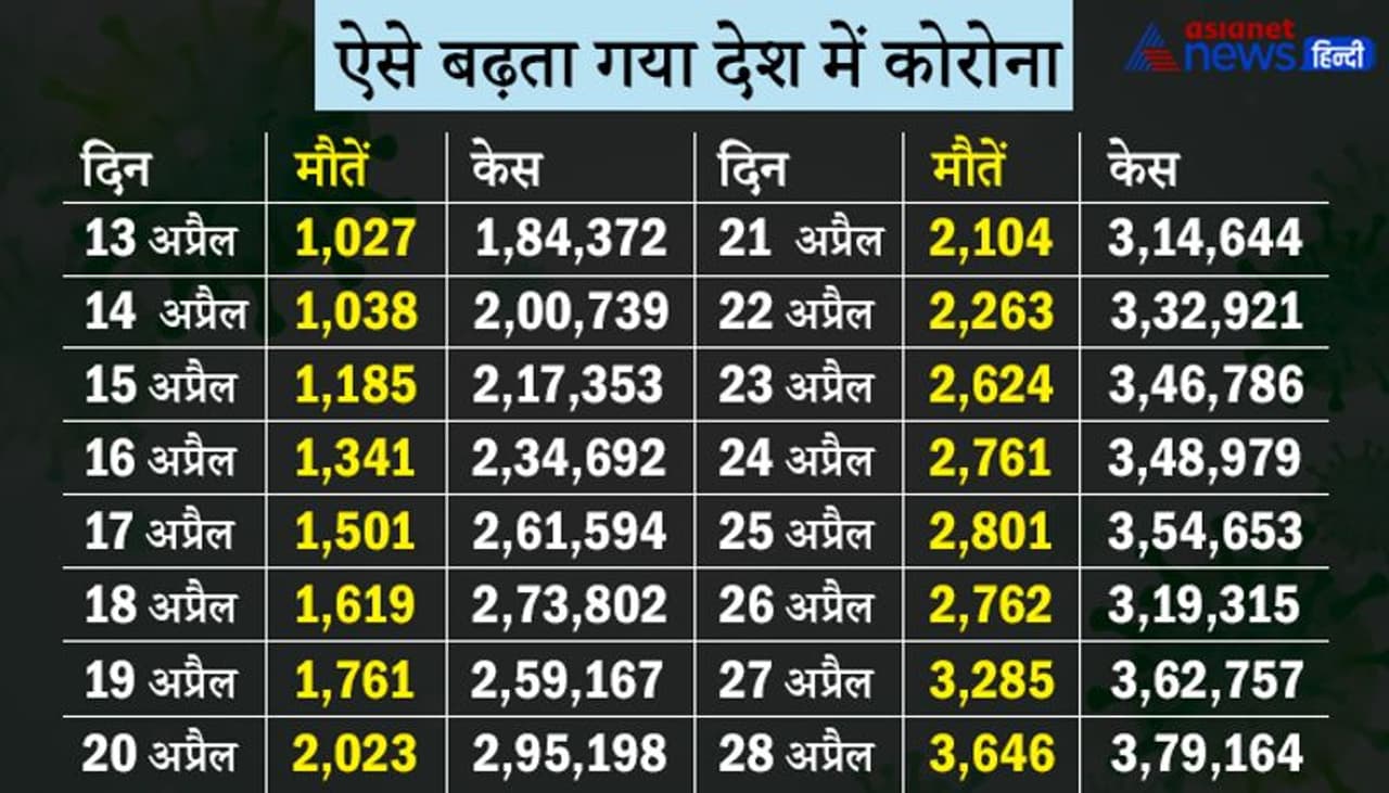 कोरोना संक्रमण की दूसरी लहर ने भारत में हाहाकार मचा रखा है। पिछले 24 घंटे में एक बार फिर रिकॉर्ड 3.80 लाख नए केस आए। इनमें अब तक कि सबसे अधिक 3,646 मौतें हुईं। यह अच्छी बात है कि संक्रमण की स्पीड के साथ ही रिकवरी रेट भी बढ़ती जा रही है। एक दिन में 2.70 लाख लोग ठीक हुए हैं। इससे पहले मंगलवार को 2.62 लाख लोग ठीक हुए थे। अगर एक दिन में हजार मौतों की बात करें, तो 13 से 19 अप्रैल तक 1000 से अधिक, 20 से 26 अप्रैल तक 2000 से अधिक और 27 अप्रैल से मौतों की संख्या 3000 क्रॉस कर चुकी है।